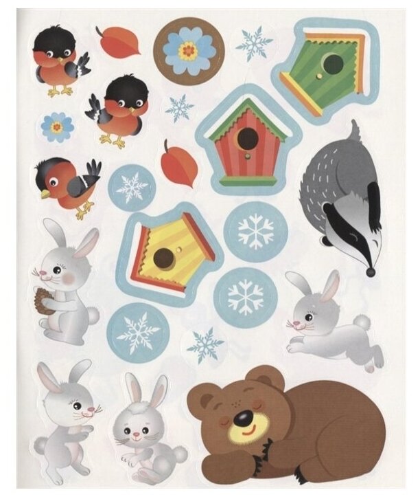 В данной книге представлены 4 времени года и что происходит в природе в это время. Весной распускаются цветы, приклеиваем цветы, гнезда вьют птицы и т.п. Лето, осень - грибы, зима и т.п. Очень любим серию этих наклеек, купили уже много. Повторно не используем, хоть и указано, что наклейки многоразовые. Просто рассматриваем, как книгу некоторое время) дети их очень любят!