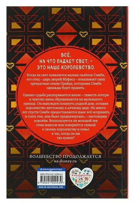 Книга прекрасно дополняет фильм! Обложка = кинопостер, оформление очень красивое, бумага качественная. По сюжету - классический сюжет мультфильма все также цепляет за душу. Книга замечательная, помогает погрузиться в атмосферу мира зверей африканской саванны не хуже, чем само кино. Очень рекомендую!