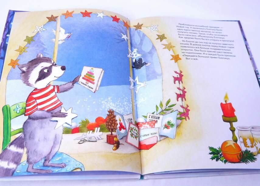 Купила своему сыну, который собирает книги про енотов. Отложу до нового года, так как и само название книги подсказывает именно это.