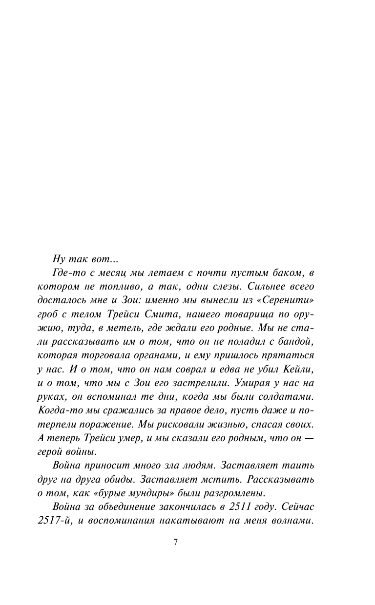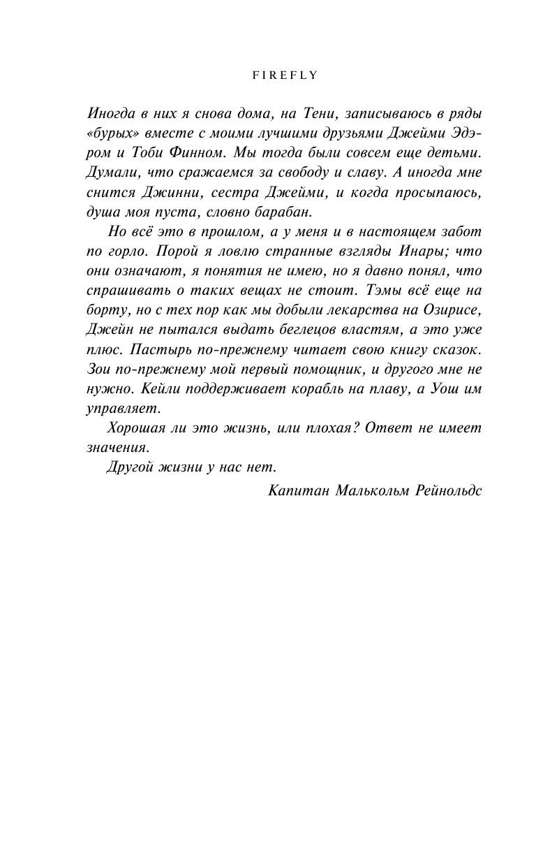 Атмосфера сериала здесь передана на 100%. Даже возникает ощущение, что описанный авторами сюжет мог быть когда-то запланирован Джоссом Уидоном, но из-за закрытия шоу увидел свет только сейчас. Особое внимание в книге уделяется Мэлу Рейнольдсу и его военному прошлому, хотя и другие участники команды вполне себя проявят.