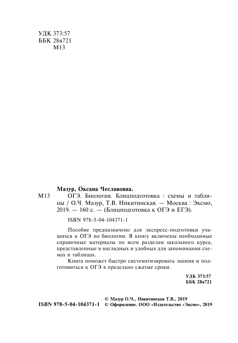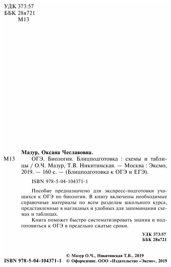 ОГЭ. Биология. Блицподготовка (схемы и таблицы) (Мазур Оксана Чеславовна, Никитинская Татьяна Владимировна); ООО "Издательство "Эксмо", 2019