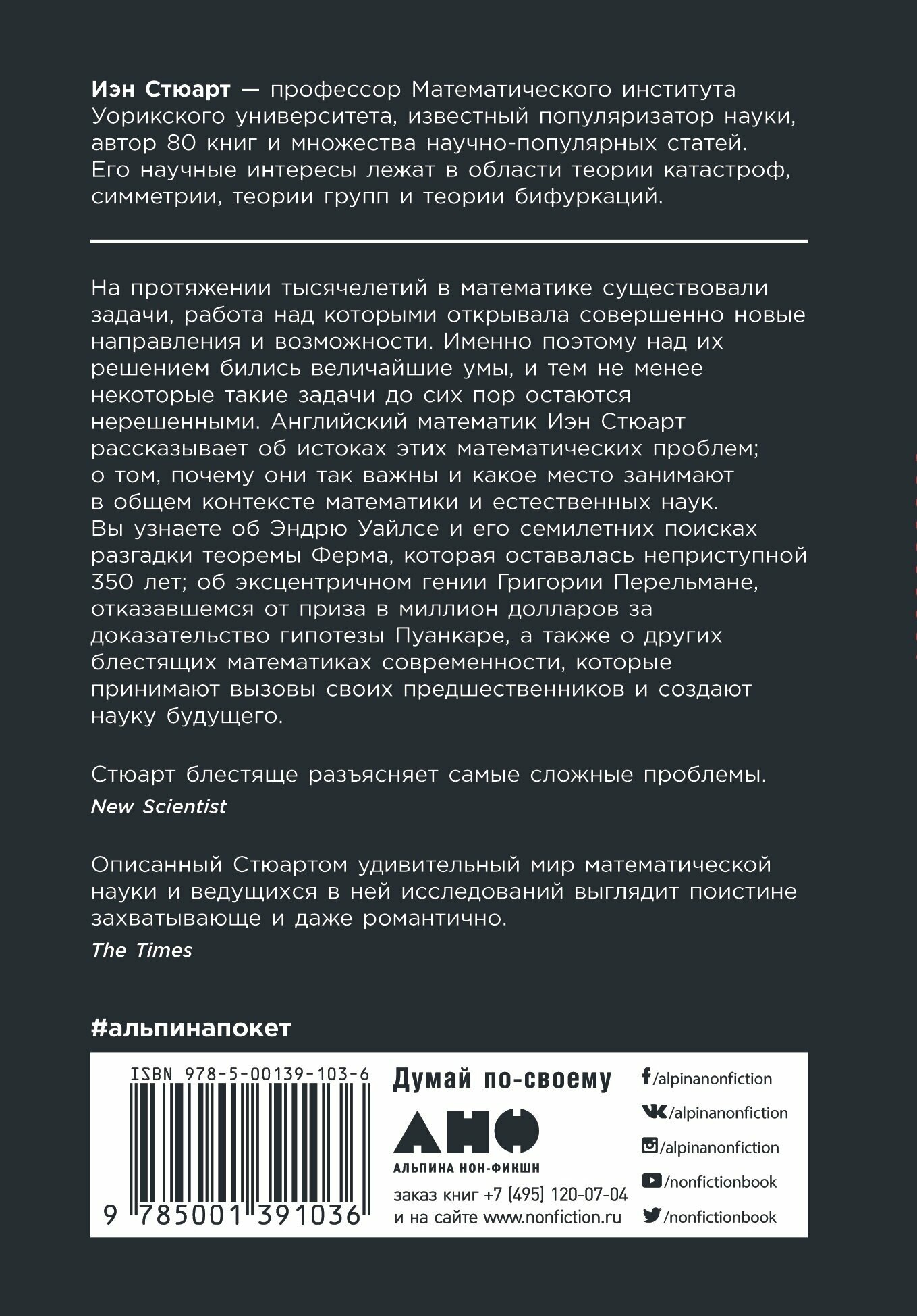 Английский математик и популяризатор науки, профессор Иэн Стюарт, помогает читателю преодолеть психологический барьер. Увлекательно и доступно он рассказывает о самых трудных задачах, над которыми бились и продолжают биться величайшие умы, об истоках таких проблем, о том, почему они так важны и какое место занимают в общем контексте математики и естественных наук.