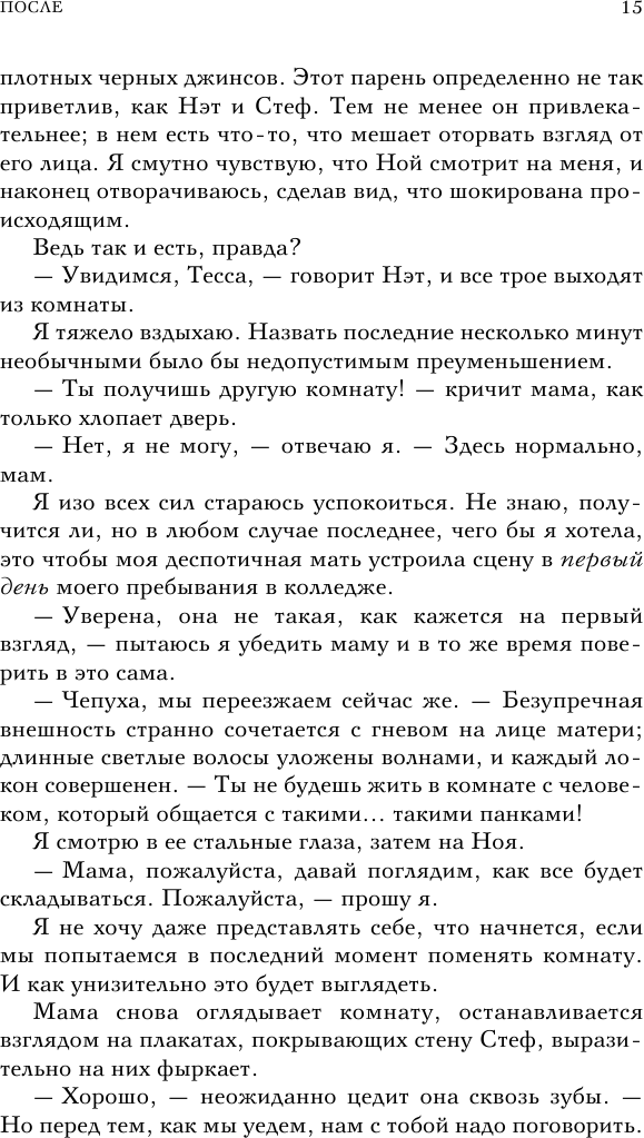 Прекрасные книги Анны Тодд, которые разгружают голову и переносят тебя в другое измерение. С первых страниц "После" захватило и не отпускало до последней прочитанной книги из всей серии. Написано простым, лёгким и понятным языком, который будет интересен и девочкам-подросткам, и взрослым женщинам, уставшим от обыденной суеты. Очень эмоциональная книга, читая ее, ощущаешь всё на себе, переносишь все переживания героев. Особенно могу порекомендовать книгу тем, кому не хватает эмоций в жизни. Сложный подросток Хардин, с тяжёлым характером, детской психологической травмой, красивый и самовлюбленный; и прилежная девочка Тесса, которая знает чего хочет от жизни, у которой ее будущее было распланировано на годы вперед. Они встретились, чтобы измотать друг-другу нервы. Казалось бы типичная история любви, но нет. Тут все запутано, захватывающе, и безумно сложно. После таких историй хочется верить в любовь. Однозначно рекомендую данную книгу к прочтению.