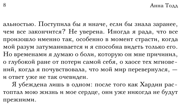Миллион читателей во всем мире следили за историей отношений Тесс и Хардина - примерной девочки и плохого парня. Тесс была прилежной ученицей и послушной дочерью, но после встречи с Хардином ее жизнь абсолютно изменилась. Оказалось, что есть на свете кое-что поважнее учебы и карьеры…