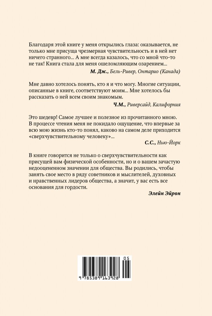Очень хорошая книга, которая помогает разобраться в себе. Если вы сверхчувствительны ко всему, что вас окружает, то эта книга для вас. Автор объясняет, что существуют разные люди и, что нет ничего страшного или плохого в сверхчувствительности. Книга очень тяжёлая и плотная. Бумага белая и качественная. А говоря о шрифте, то он крупный. Поэтому, данную книгу легко читать. Советую!