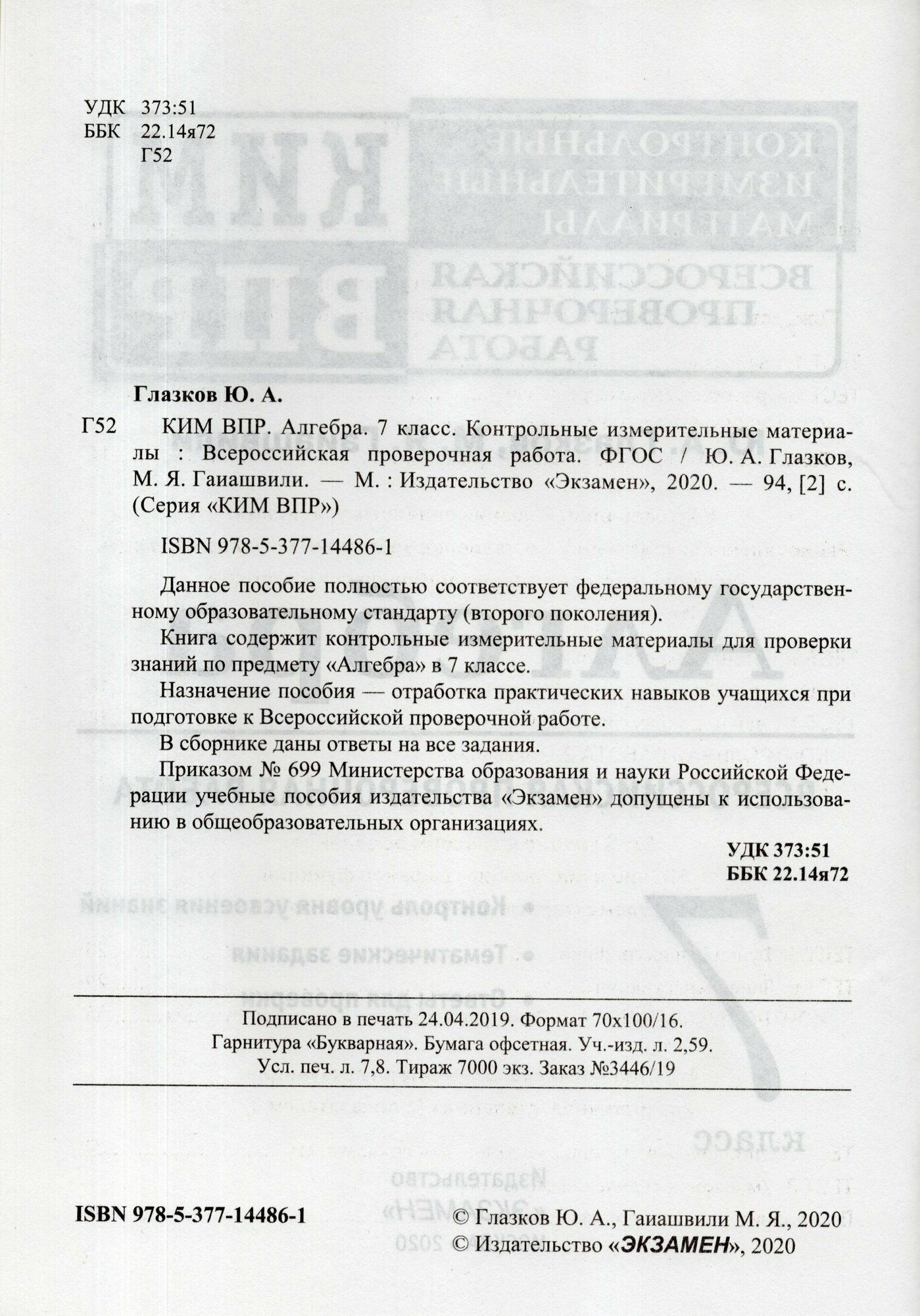 КИМ ВПР. Алгебра. 7 класс. Контрольные измерительные материалы : Всероссийская проверочная работа. (Гаиашвили Мария Яковлевна, Глазков Юрий Александрович); Спиши.ру, 2020