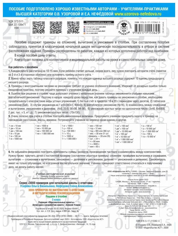 3000 примеров по математике с ответами и методическими рекомендациями. Решаем в столбик. 3 класс (Узорова Ольга Васильевна, Нефедова Елена Алексеевна); ИЗДАТЕЛЬСТВО "АСТ", 2020
