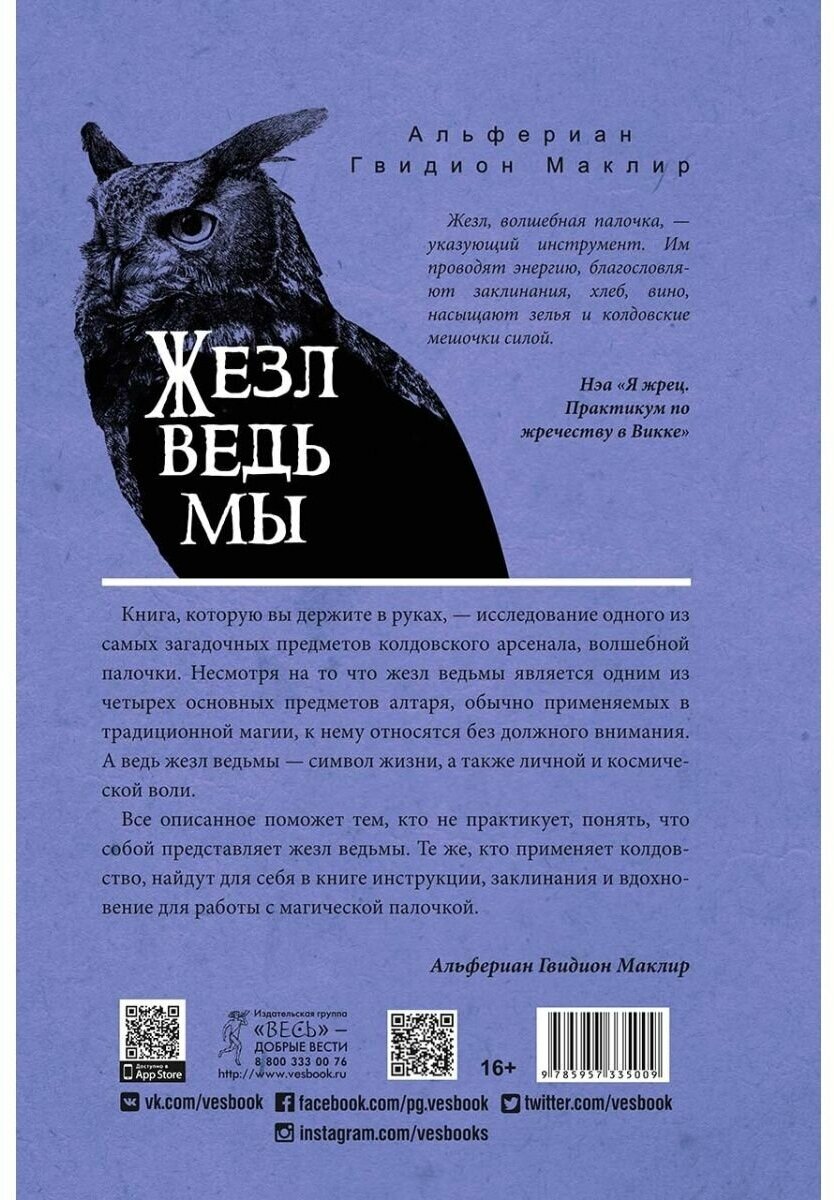 Очень интересно написано о магических жезлах. Автор рассказывает не только об истории жезла с описанием жезлов Меркурия, Гермеса, Соломона, других жезлов но и подробно о частях магического жезла, о магических свойствах деревьев и камней, которые можно использовать для создания жезлов, как самостоятельно сделать и зарядить жезл, приводит примеры заклинаний с жезлом, особенности жезлов для сезонных праздников. В книге есть иллюстрации различных видов жезлов. Очень рекомендую, действительно интересно.