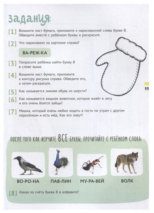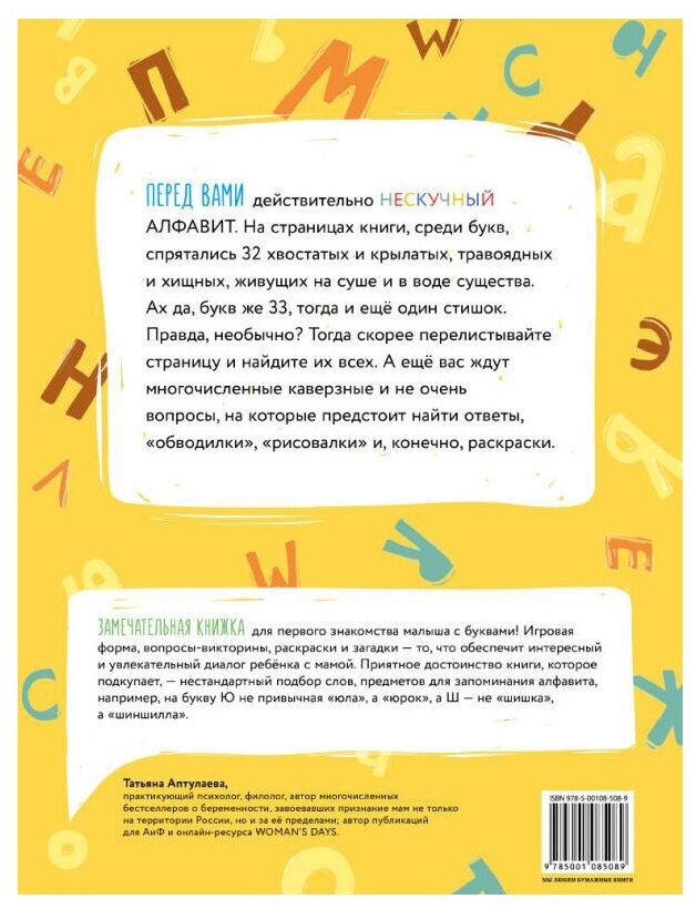 Перед вами действительно НЕСКУЧНЫЙ АЛФАВИТ. На его страницах, среди букв, спрятались 32 хвостатых и крылатых, травоядных и хищных, живущих на суше и в воде существа. Ах да, букв же 33, тогда и ещё один стишок. Правда, необычно? Тогда скорее перелистывайте страницу и найдите их всех. А ещё вас ждут многочисленные каверзные и не очень вопросы, на которые предстоит найти ответы, "обводилки", "рисовалки" и, конечно, раскраски.