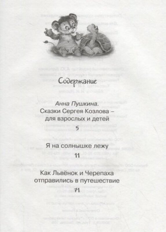В книгу вошли любимые многими малышами сказочные повести Сергея Козлова о приключениях Львёнка по имени Ррр-Мяу и Большой Черепахи: "Я на солнышке лежу" и "Как Львёнок и Черепаха отправились в путешествие".