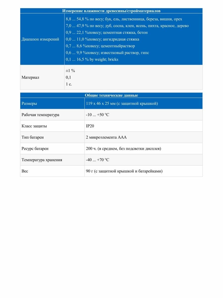 | Измеряемые материалы | бук, ель, лиственница, береза, вишня, opex, дуб, сосна, клен, ясень, пихта, красноe, деревo, цементная стяжка, бетон, ангидридная стяжка, цементный раствоp, известковый раствор, гипc |