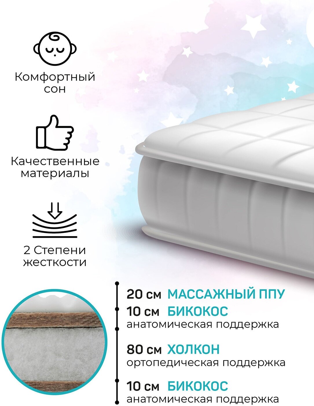 Ортопедическое основание поддерживает спину и обеспечивает правильное формирование позвоночника младенца. А массажный эффект нежно снимет повышенный тонус мышц, поможет кровообращению улучшит качество сна и иммунитет крохи