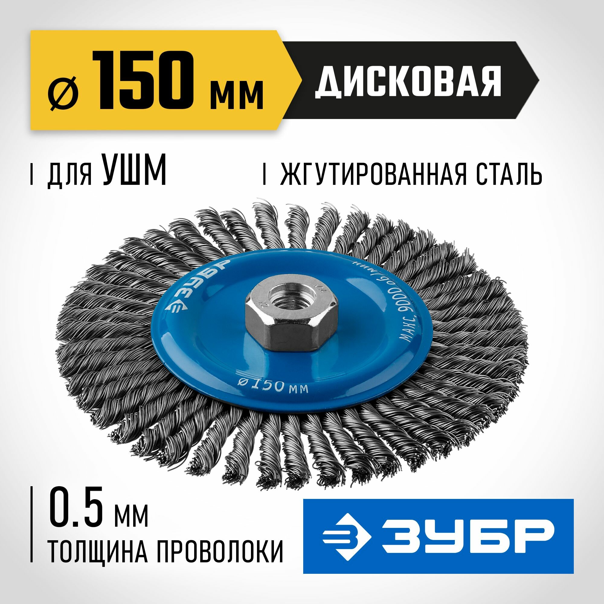 ЗУБР O 150 мм, проволока 0.5 мм, щетка дисковая для УШМ Профессионал ()Модель - Технические характеристики:-Диаметр: 150 мм-Тип щетки: Дисковая -Тип электроинструмента: УШМ -Проволока: стальная жгутированная -Диаметр проволоки: 0,5 мм-Макс. скорость вращения: 9000 об/минКаждая щетка-крацовка ЗУБР проходит обязательный контроль качества. Все изготавливаемые щетки соответствуют действующим стандартам качества и обеспечивают безопасную работу в четко регламентированном диапазоне оборотов.Преимущества:Стальная жгутированная проволокаПовышенный ресурс щетки благодаря еще более высокой жесткости сплетенного пучка и увеличенной толщине проволоки
