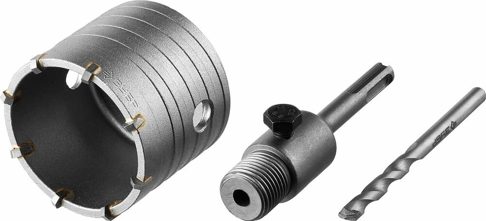 Коронка по бетону с оснасткой Зубр предназначена для сверления отверстий в бетоне, кирпиче, природном и искусственном камне, а также плотных известняках. Используется с дрелями и перфораторами мощностью не менее 850 Вт в режиме ударного сверления. Используются прокладке коммуникаций в строящемся здании. Позволяют без труда получать отверстия среднего или большого диаметра в самых прочных материалах.Преимущества: Твердосплавные зубья из сплава ВК8 позволяют эффективно дробить обрабатываемый материал Специальная спиралевидная форма корпуса коронки из высокопрочной стали уменьшает трение о стенки отверстия, ускоряет отвод шлама и повышает срок службы инструмента Коронка по бетону с полной оснасткой Державка SDS-plus из легированной стали Резьбовая посадка М22 обеспечивает надежное крепление коронки с державкой Фиксация центрирующего сверла винтом Износостойкое покрытие защищает от коррозии