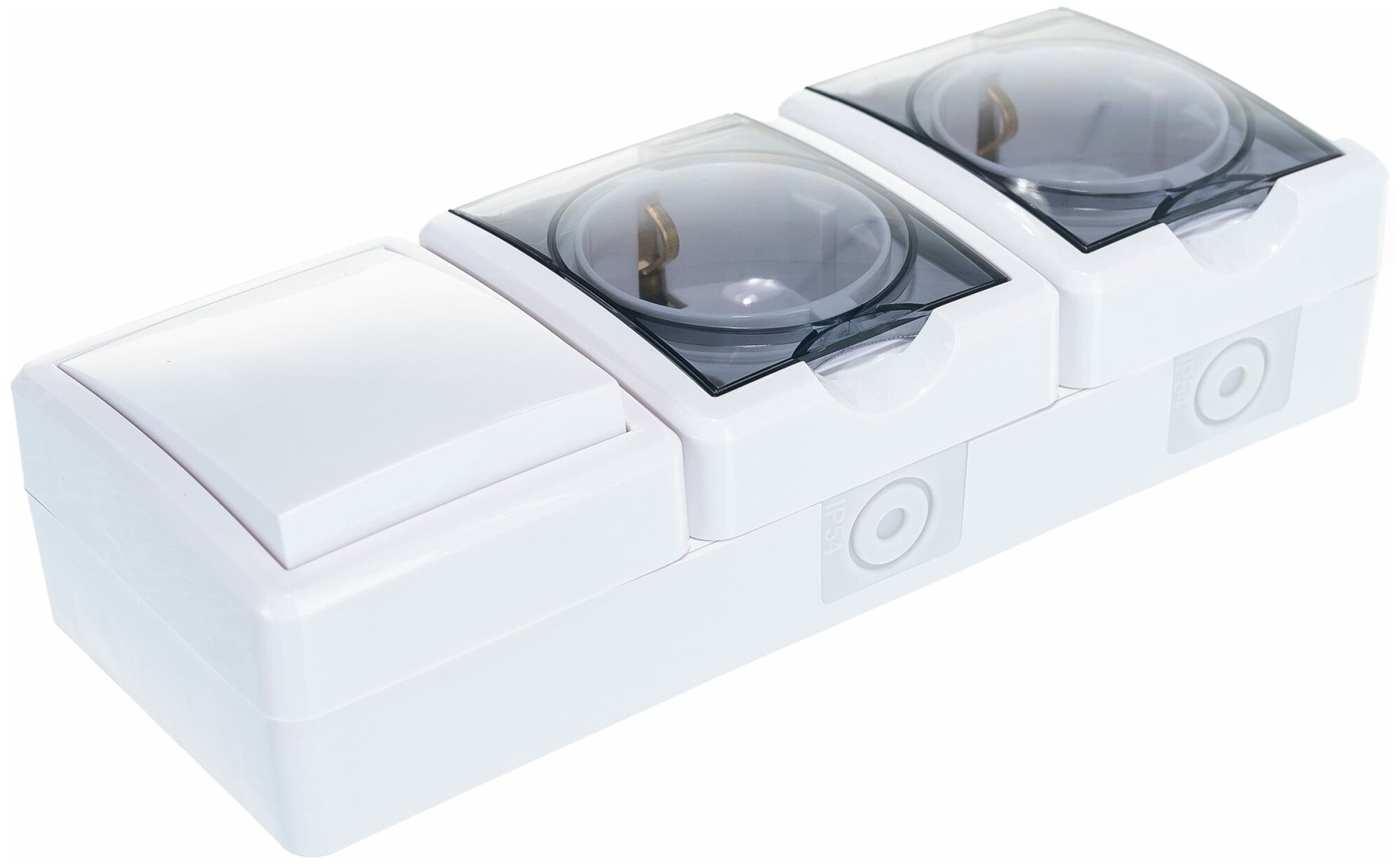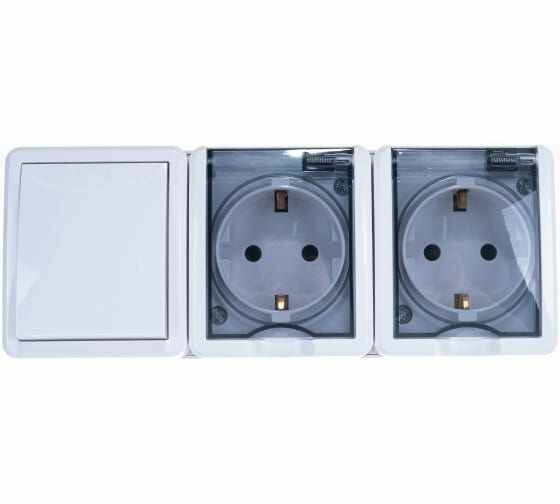 Блок: две розетки+выключатель ЭРА Эксперт IP54, 16АХ10AX-250В, ОУ, белый Б0027673 единое устройство, сочетающее в своей конструкции одновременно одноклавишный выключатель и два розеточных гнезда с защитными шторками, заземляющими контактами и прозрачными защитными крышками. Устройство выполнено из качественного поликарбоната, оснащёно уникальными винтовыми клеммами для максимально качественного зажима кабеля в механизме.