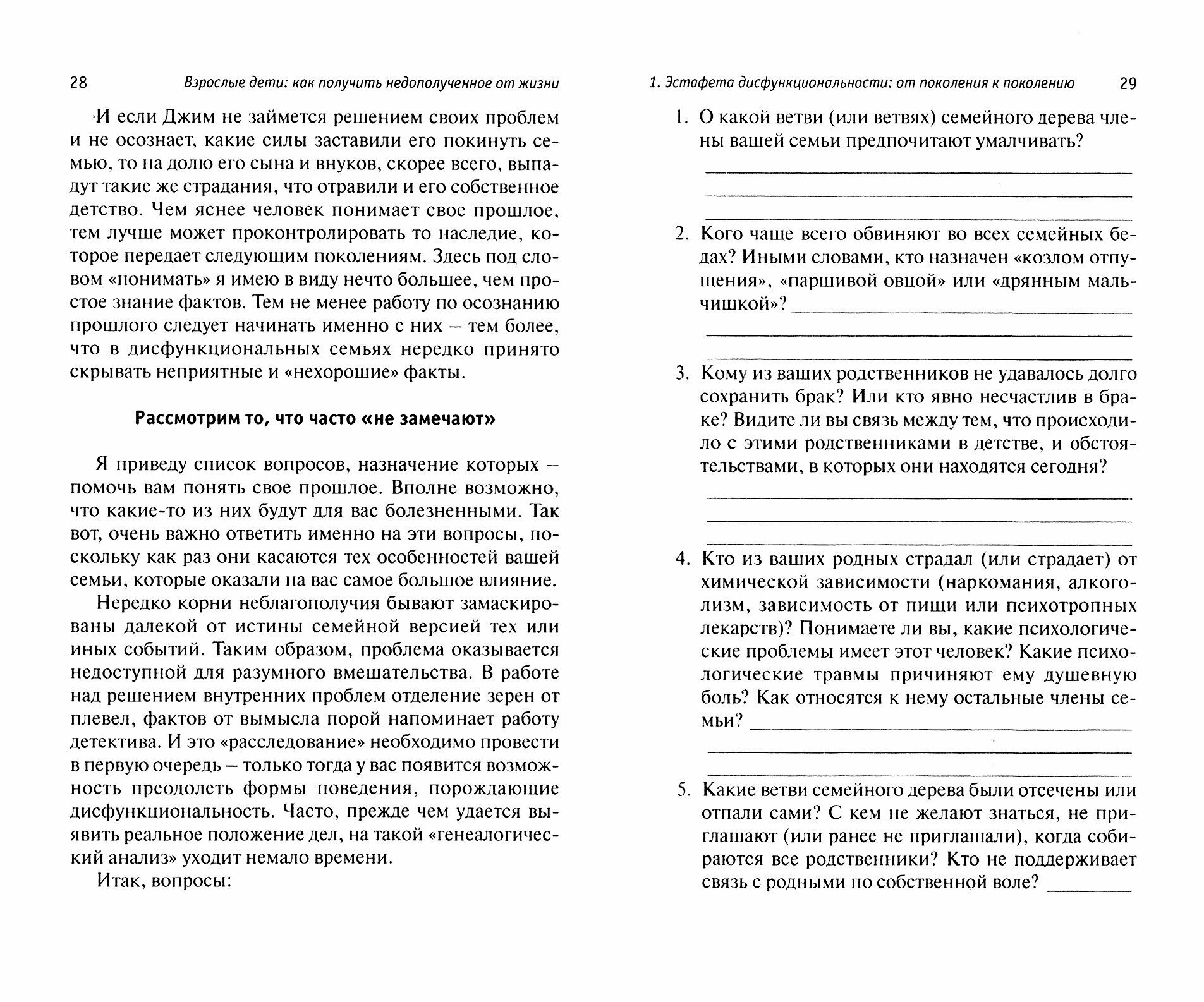 Даже у самых вроде бы благополучных семей имеются проблемы, которые все члены семьи или искренне не видят, или старательно скрывают не только от окружающих, но и от самих себя. Отсутствие близости, нездоровые пристрастия, различные виды насилия (психологического, физического, сексуального), созависимость - эти и другие дисфункции передаются из поколения в поколение. Ребенок усваивает от родителей или других значимых для него взрослых семейные модели поведения, которые неизбежно воспроизведутся в семье, созданной им самим, когда он вырастет. Все новые и новые семьи становятся дисфункциональными, неблагополучными - они не выполняют всех своих функций, недополучают благодати. В родительской семье закладываются не только проблемы отношений, но и личностные, которые всю жизнь будут мучить уже взрослого ребенка. Можно ли разорвать эту цепь боли и страданий? Оказывается, можно. Незаменимую помощь в этом нелегком деле окажет книга "Взрослые дети: как получить недополученное от жизни". Ее авторы, десятки лет работающие с дисфункциональными семьями и выходцами из них, помогут вам выявить проблемы - ваши и вашей семьи - и шаг за шагом проведут вас по пути исцеления.