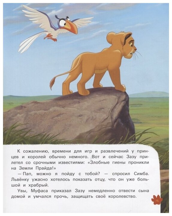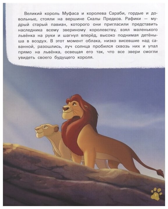 Наконец нам пришла наша долгожданная книга "Король Лев. Путь короля"! Сынуля счастлив, я тоже довольна покупкой. Достаточно большой формат, яркая обложка, мелованная бумага, красочные иллюстрации, интересная история про знакомых по фильму героях. Много, очень много прекрасных иллюстраций, кстати, именно они занимают большую часть страниц, разворотов. Текста немного, шрифт крупный, удобный. Идеальная книга для начинающего читателя!! Малышам, не умеющим читать, она тоже должна понравиться:)