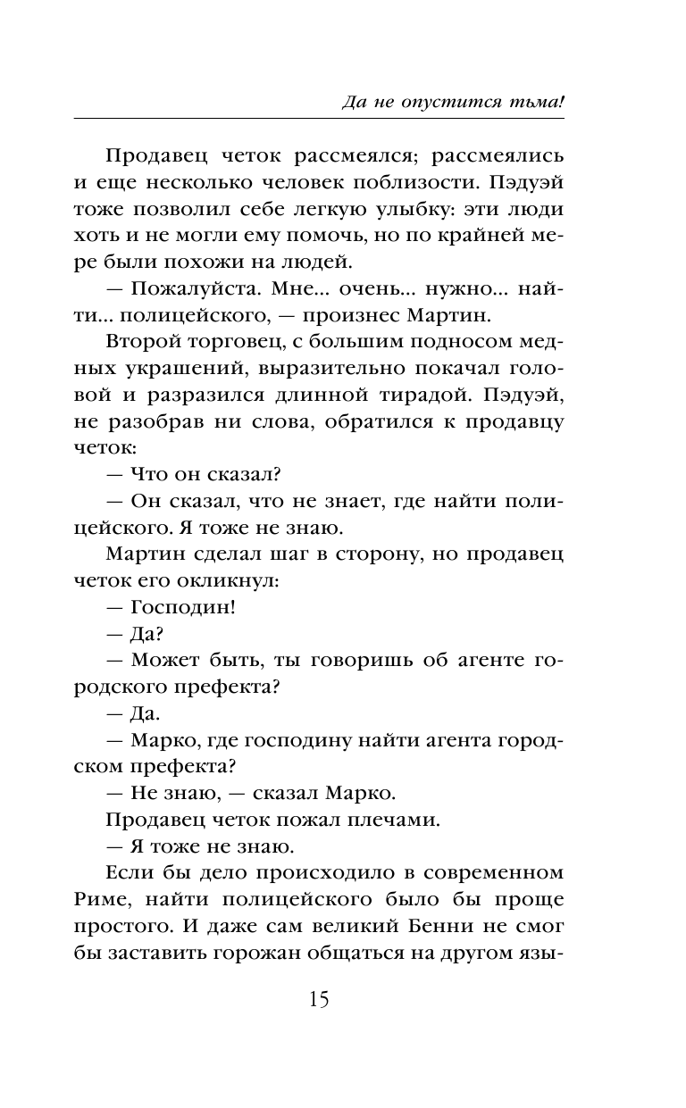 "Да не опустится тьма!"ещё один роман писателя Лайона Спрэга де Кампа опубликованный в замечательной серии книг "Звёзды интеллектуальной фантастики",на сей раз это образец действительно качественной,добротной именно интеллектуальной фантастики,так называемой "хронооперы"потому что его главному герою археологу Мартину Пэдуэю,вовсе даже не супермену,предстоит переместившись во времени решать сложные проблемы именно с помощью своего интеллекта и знаний из разных областей науки,произведение достаточно интересное и увлекательное,написанное легко, можно рекомендовать всем ценителям качественной фантастики.
