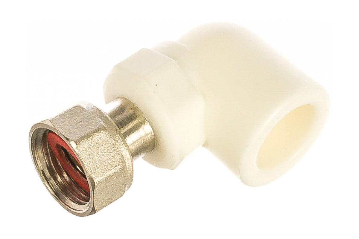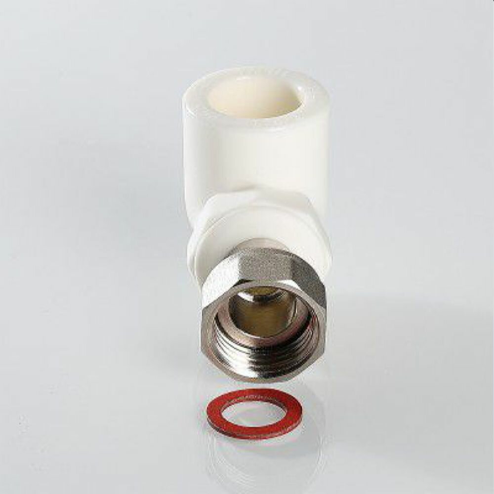 Двухсторонний полипропиленовый фитинг для соединения под углом 90 градусов Цельсия друг к другу полипропиленового трубопровода и компонента инженерной системы с резьбовым подключением. Монтаж осуществляется с помощью накидной гайки. Резьба - внутренняя трубная по ГОСТу 6357