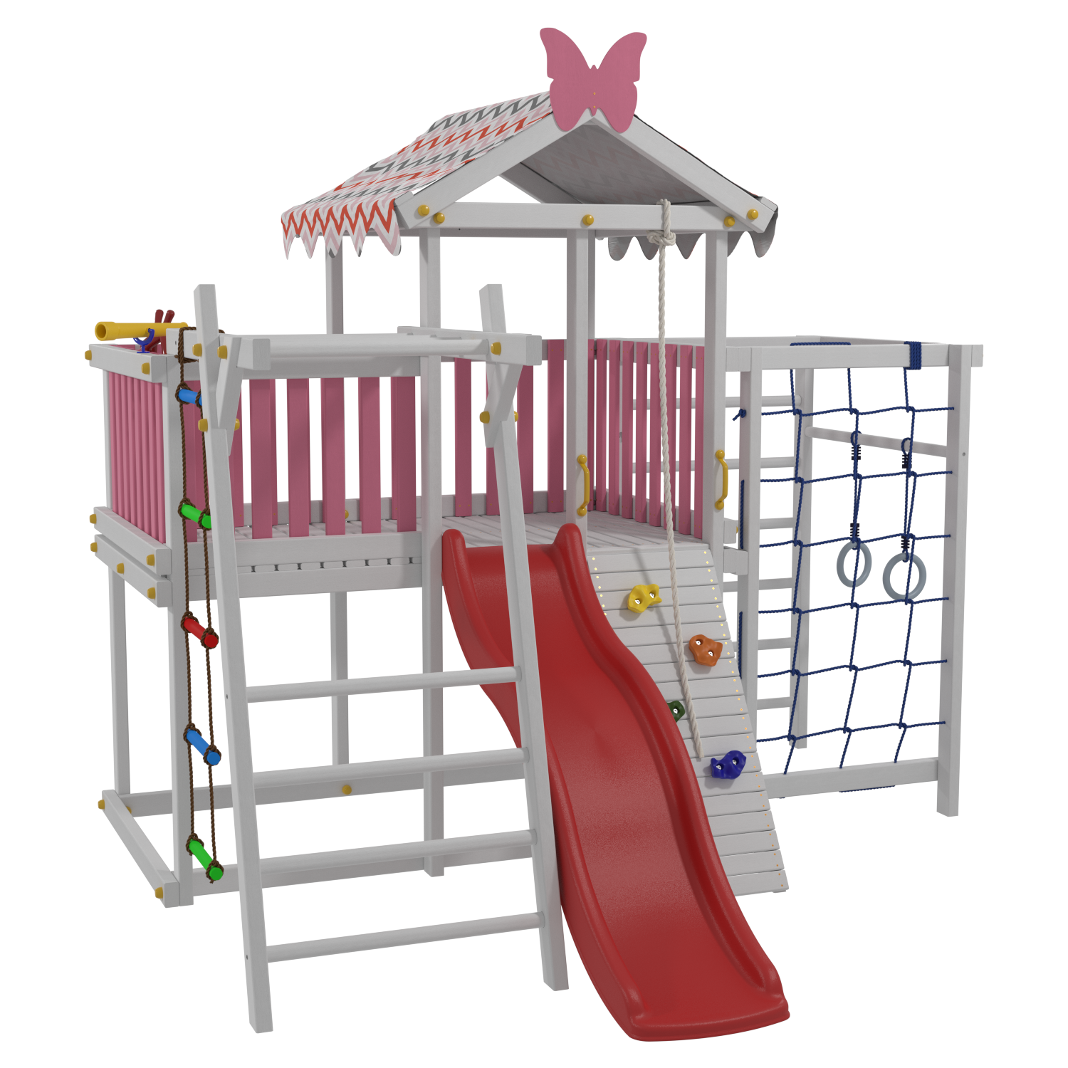 | Комплектация | гимнастические кольца; горка; лесенка; турник; шведская стенка; веревочная лестница; рукоход; скалодром |