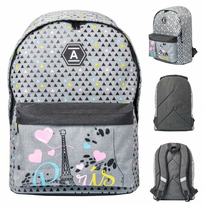 Рюкзак ACTION повседневный, для девочек, с оригинальными принтами. На нижнем кармане-принт с видом Эйфелевой башни. Рюкзак имеет 1 отделение на молнии, 1 дополнительный карман на молнии на передней панели, открытые боковые карманы. Мягкая спинка, уплотненные S-образные задние лямки со световозвращающими полосками безопасности регулировкой снизу, верхняя ручка-петелька. Материал-жаккардовый полиэстер.