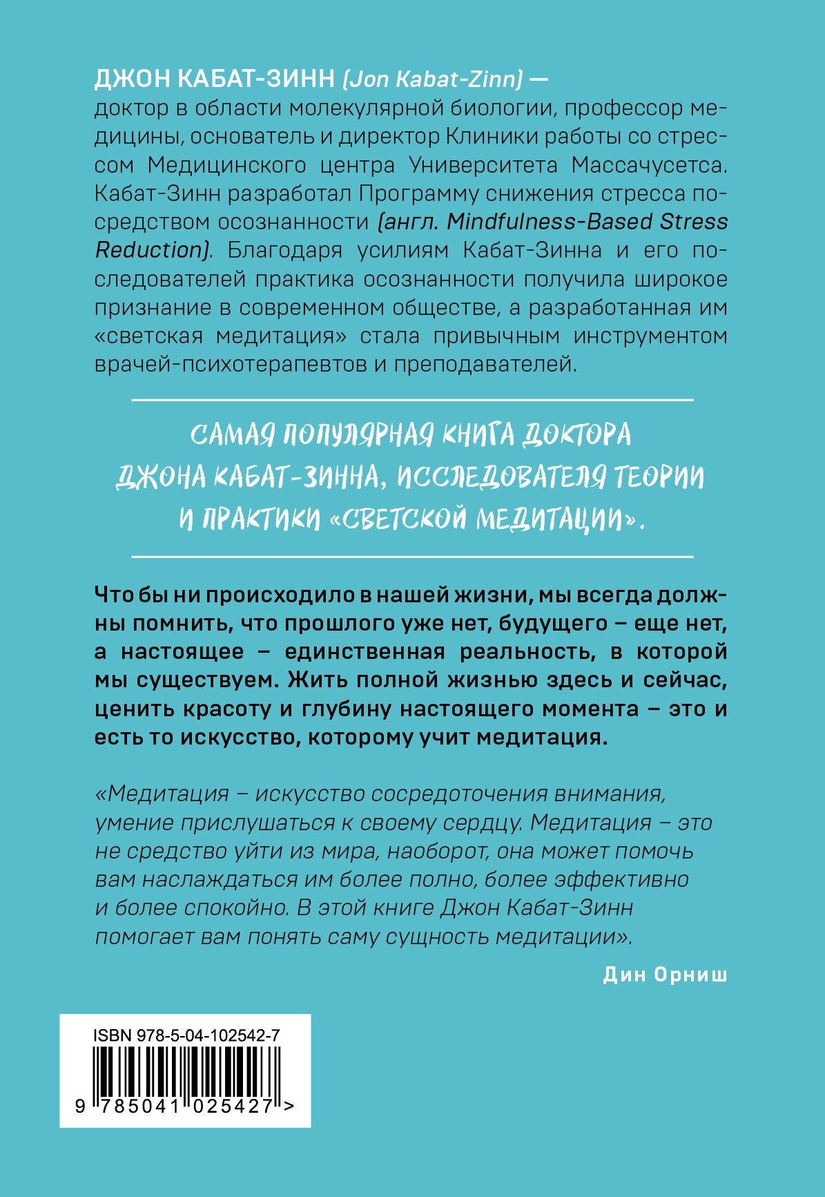 Хочу предостеречь: книга не простая, но прочесть ее стоит. Автор не диктует, он советует, поэтому читая книгу ведешь нить рассуждения вместе с автором. Джон Кабат-Зинн отводит особое место текущему моменту жизни (его мысль в том, что по-настоящему живем мы не в прошлом и не в будущем, а в настоящем). Автор с уважением относится к практикам буддизма, поэтому отдельные цитаты и техники последователей этого течения приведены в книге.