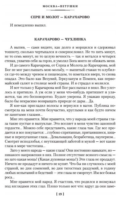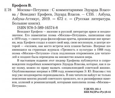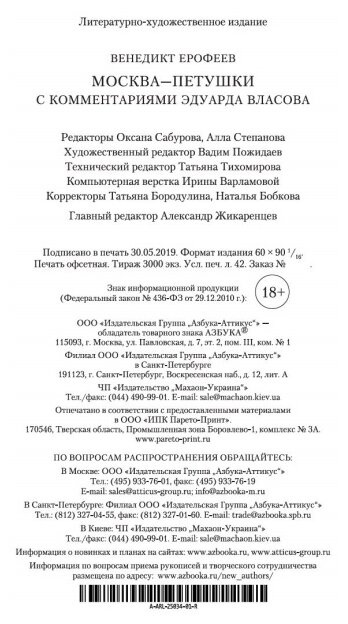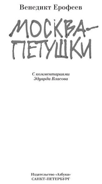 В настоящем издании этот шедевр Ерофеева публикуется в сопровождении подробных комментариев Эдуарда Власова, которые, как и саму поэму, можно по праву назвать "энциклопедией советской жизни". Опубликованные впервые в 1998 году, комментарии Э. Ю. Власова с тех пор уже неоднократно переиздавались. В них читатели найдут не только пояснения многих реалий советского прошлого, но и расшифровки намеков, аллюзий и реминисценций, которыми наполнена поэма "Москва - Петушки".