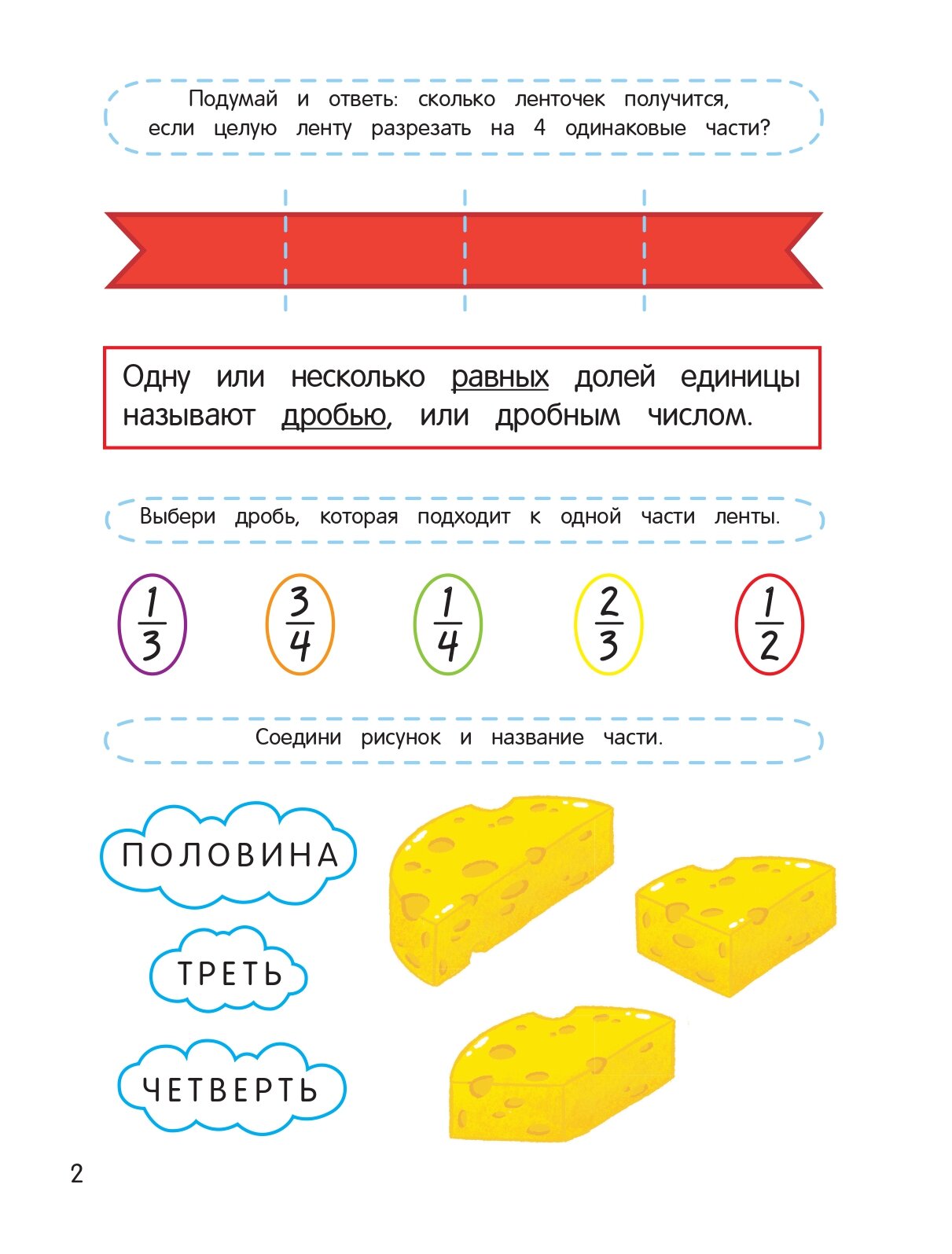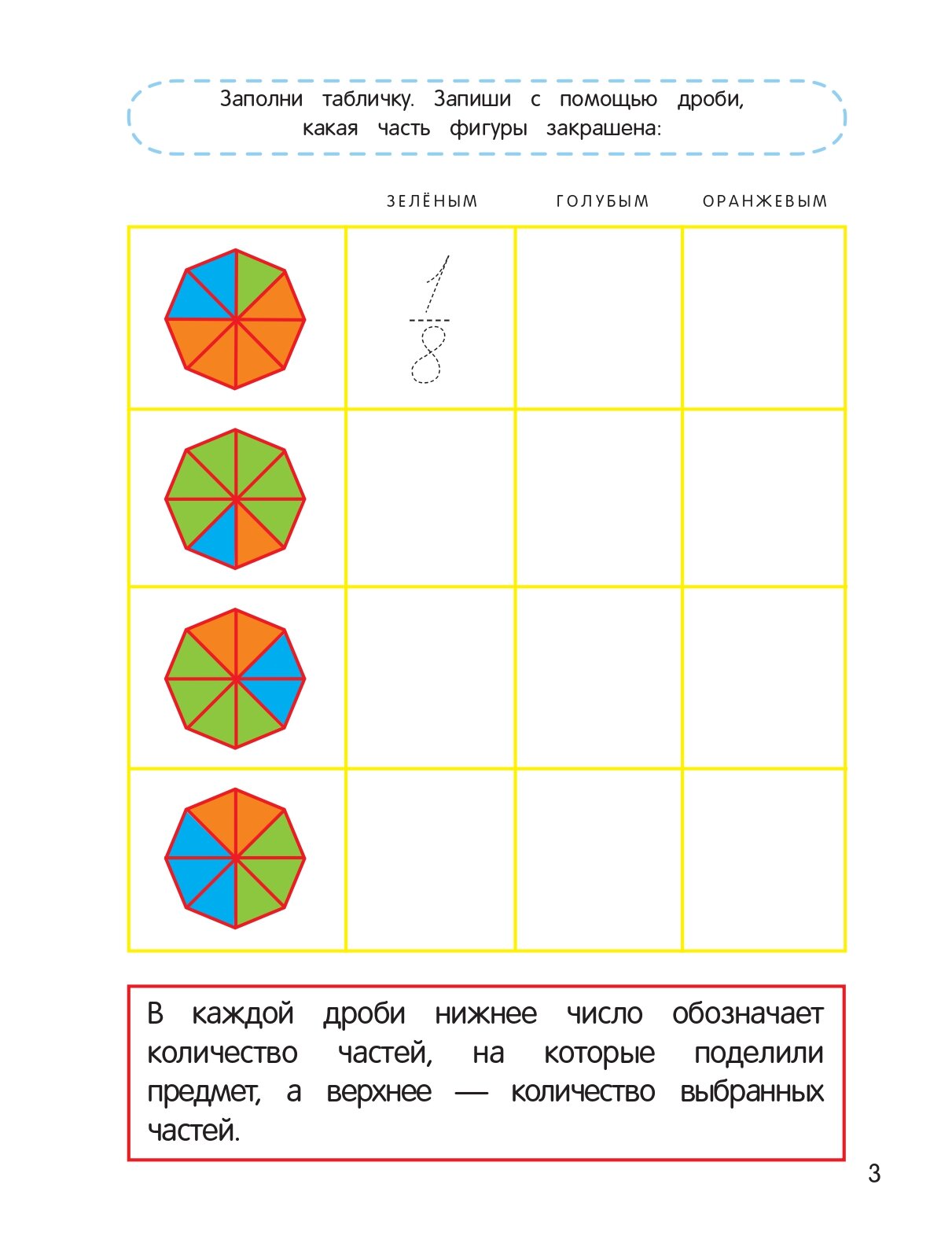 Пособие понравилось, печать качественная и задания хорошие. Большая часть упражнений посвящена узнаванию дробей по рисунку, или наоборот, изображению дроби на рисунке; чтению и написанию дробей. Есть упражнения на сравнение дробей по картинке и без нее, и несколько примеров на сложение и вычитание дробей без иллюстраций.