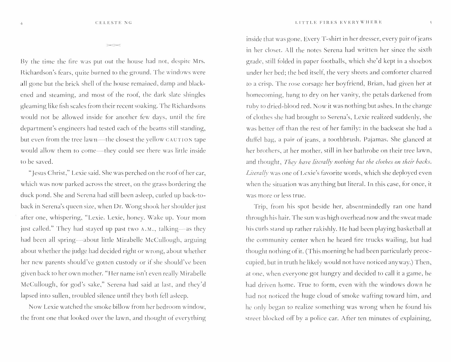 Everyone in Shaker Heights was talking about it that summer: how Isabelle, the last of the Richardson children, had finally gone around the bend and burned the house down.In Shaker Heights, a placid, progressive suburb of Cleveland, everything is meticulously planned - from the layout of the winding roads, to the colours of the houses, to the successful lives its residents will go on to lead. And no one embodies this spirit more than Elena Richardson, whose guiding principle is playing by the rules.Enter Mia Warren - an enigmatic artist and single mother- who arrives in this idyllic bubble with her teenage daughter Pearl, and rents a house from the Richardsons. Soon Mia and Pearl become more than just tenants: all four Richardson children are drawn to the mother-daughter pair. But Mia carries with her a mysterious past, and a disregard for the rules that threatens to upend this carefully ordered community.When old family friends attempt to adopt a Chinese-American baby, a custody battle erupts that dramatically divides the town - and puts Mia and Elena on opposing sides. Suspicious of Mia and her motives, Elena is determined to uncover the secrets in Mia's past. But her obsession will come at an unexpected and devastating cost...