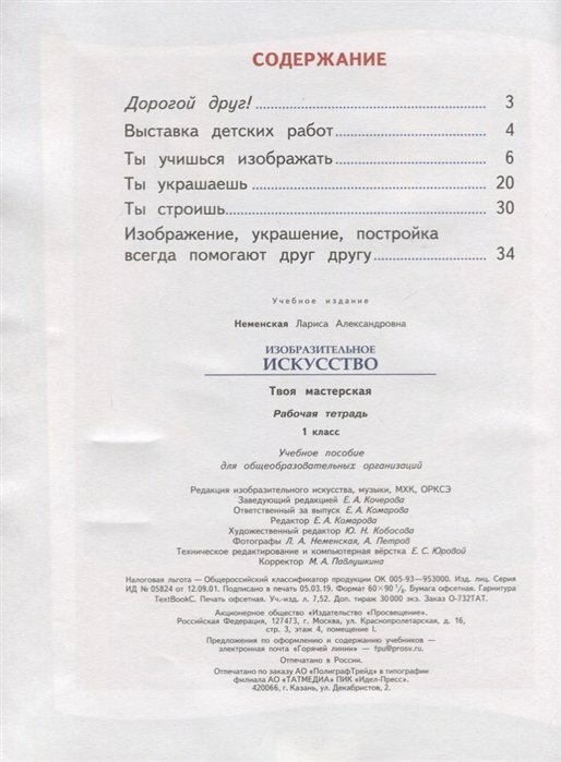 Рабочая тетрадь вместе с учебником Л. А. Неменской "Изобразительное искусство. Ты изображаешь, украшаешь и строишь. 1 класс" составляет единый учебный комплект.