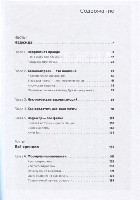 Книгой автора про искусство пофигизма я осталась очень довольна, рекомендовала друзьям, которые тоже прочли ее с удовольствием. Эта же книга – о надежде – шла уже с большим трудом. Первая часть мне совершенно не понравилась, автор пускается в пространные размышления, прикладывая в качестве якобы доказательств своих слов различные источники на те или иные события, факты, теорию. Я была расстроена и едва заставляла себя читать. На каждой странице думала "что за бред". Но надеялась, что что-то может измениться. И, да, свершилось – вторая часть книги оказалась куда лучше. Седьмая, восьмая и девятая главы мне даже понравились. Посоветую разве что их (ну и шестую главу, чтобы понимать, о чем говорится в седьмой). Название, к слову, опять связано с явной провокацией – автор не предлагает отказаться от надежды, не говорит, что все плохо и нет смысла барахтаться; он предлагает посмотреть на все это с другого угла. В целом, я с ним согласна (хотя и на сей раз далеко не во всем), но книга вышла значительно хуже первой. Издание порекомендую, но только из-за второй части.