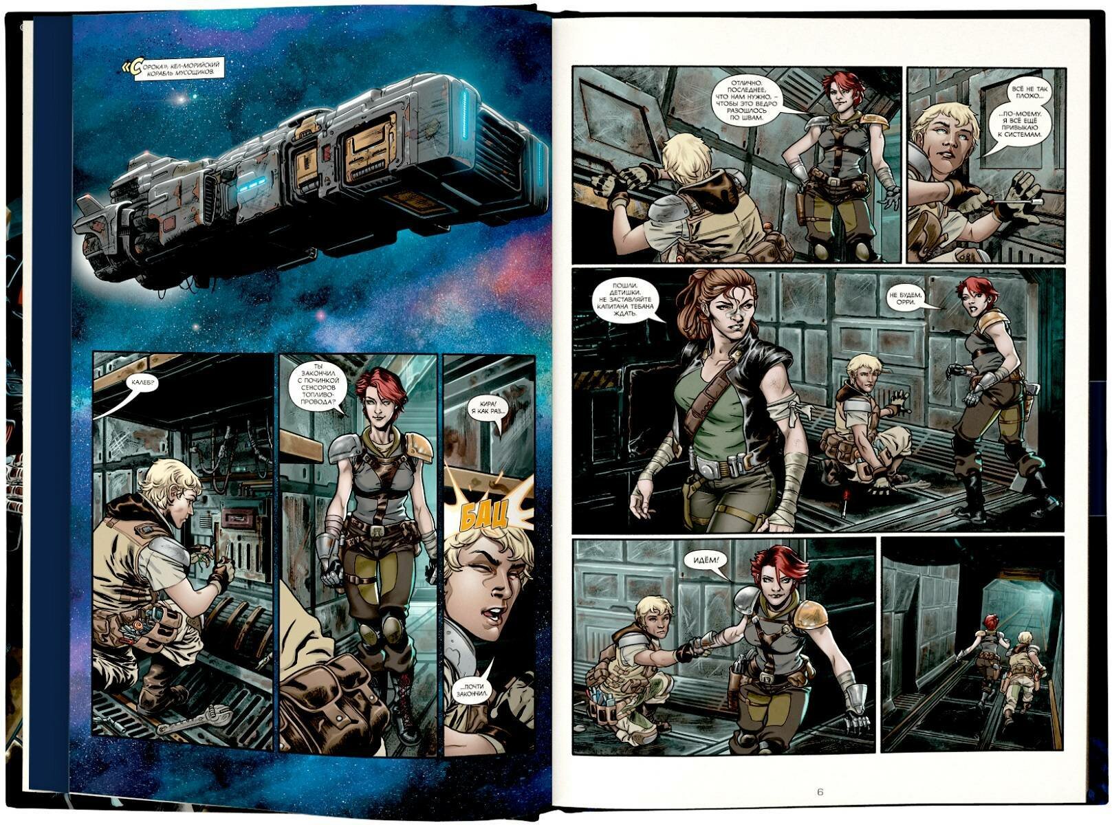Комикс понравился, представляет из себя триллер в космосе, местами жестокий. Только читается очень быстро. Рисунок очень приятный. Непосредственно к сюжету игр события данного комикса не относятся. Как я понял, действие происходит между серединой первой части и началом второй. Тут история отдельных людей в интересной ситуации. Конец как таковой тут есть, но история не закончилась. Хочется увидеть и продолжение, о чём намекают. Из бонусов представлены обложки к выпускам и они спойлерные, поэтому хорошо, что они все в конце находятся, а не по ходу чтения. Тут кстати всё читается как один длинный комикс без резделения на главы. Листы книги прошиты между собой, но переплёт жёсткий, то есть комикс плохо раскрывается - чуть лучше ТПБ.