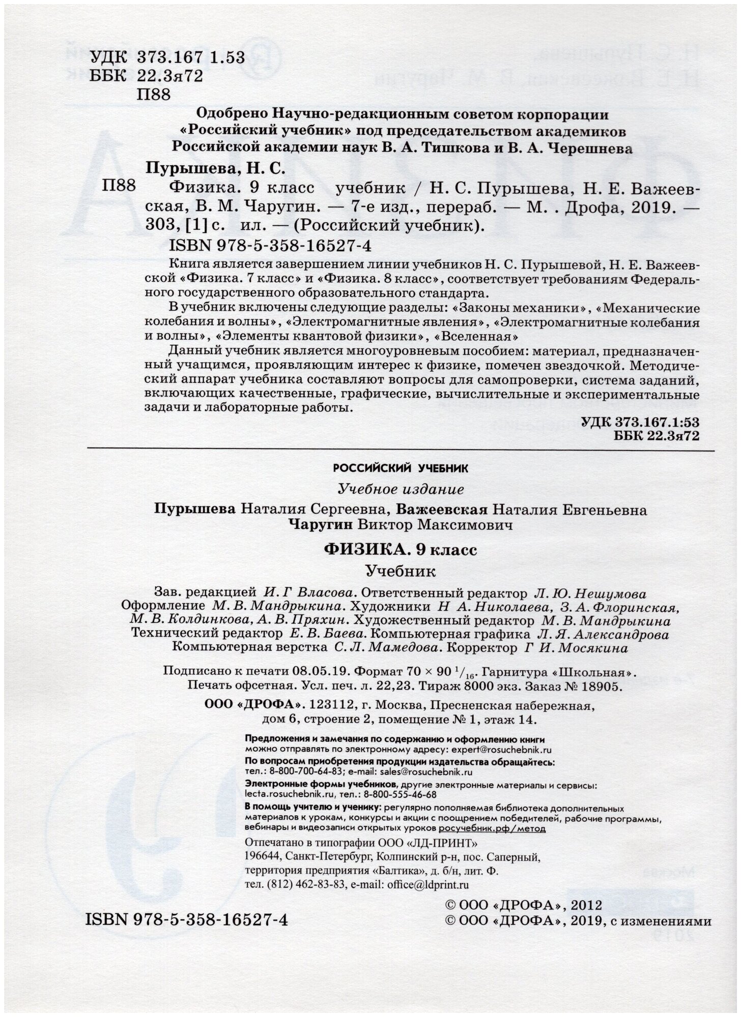 Книга является завершением линии учебников Н. С. Пурышевой, Н. Е. Важеевской "Физика. 7 класс" и "Физика. 8 класс", соответствует требованиям Федерального государственного образовательного стандарта. В учебник включены следующие разделы: "Законы механики", "Механические колебания и волны", "Электромагнитные колебания и волны", "Элементы квантовой физики", "Вселенная". Данный учебник является многоуровневым пособием: материал, предназначенный учащимся, проявляющим интерес к физике, помечен звездочкой. Методический аппарат учебника составляют вопросы для самопроверки, система заданий, включающих качественные, графические, вычислительные и экспериментальные задачи и лабораторные работы. Рекомендовано Министерством просвещения Российской Федерации.