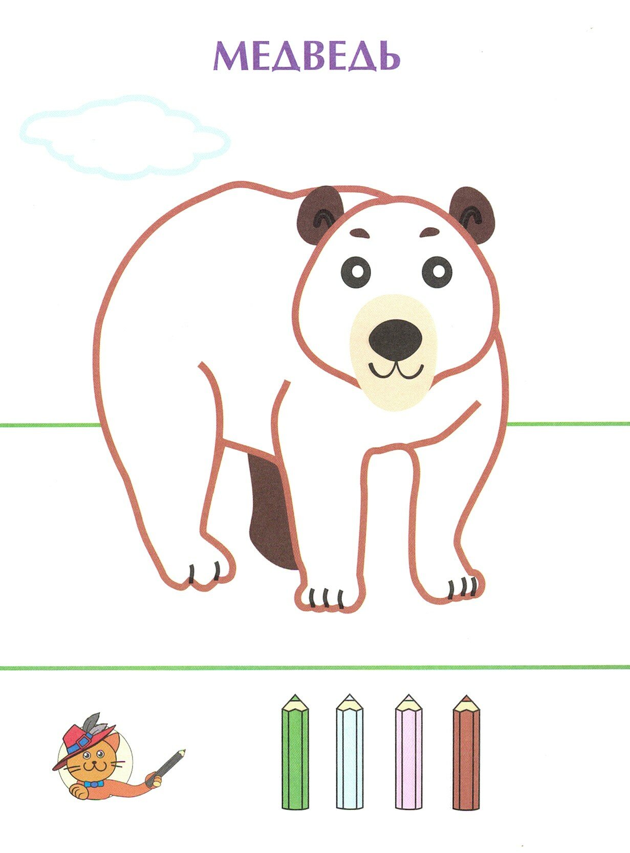 Развитие моторики руки и навыков рисования Цветной образец для раскрашивания Увеличенная линия контура рисунка Изучение цветов и их оттенков Задания от Кота в сапогах