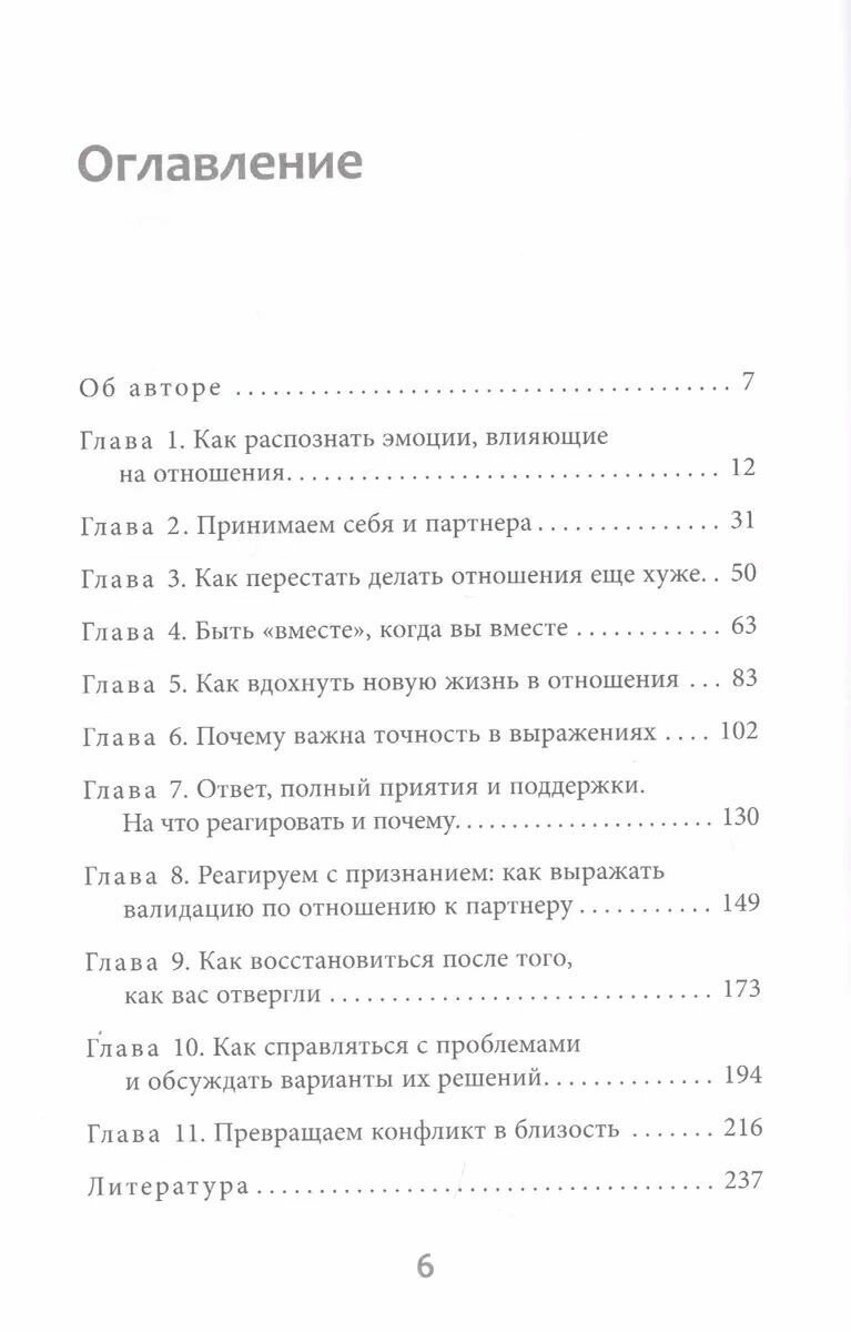 Конфликты разъедают отношения внутри пары и делают обоих участников несчастными. Основная идея книги в том, что достигшие накала негативные эмоции - нерегулируемые эмоции - являются главной проблемой конфликтных пар. Благодаря особым поведенческим навыкам партнеры смогут эффективно управлять своими эмоциями. Это позволит точнее выражать свои чувства и мысли, осознавать мотивы поведения, лучше понимать друг друга. При достаточной практике конфликт можно превратить в близость - любая пара способна достичь доверительных, уважительных отношений, полных мира и поддержки, которые даруют радость и любовь.