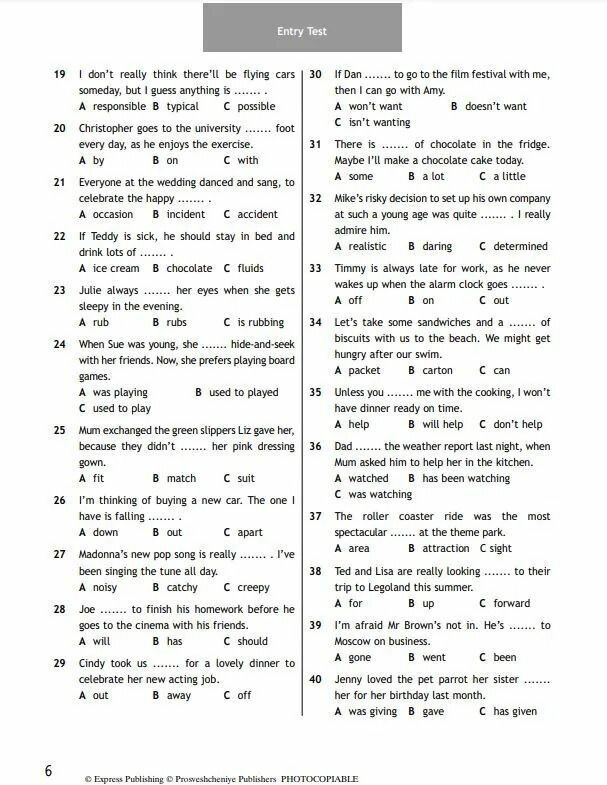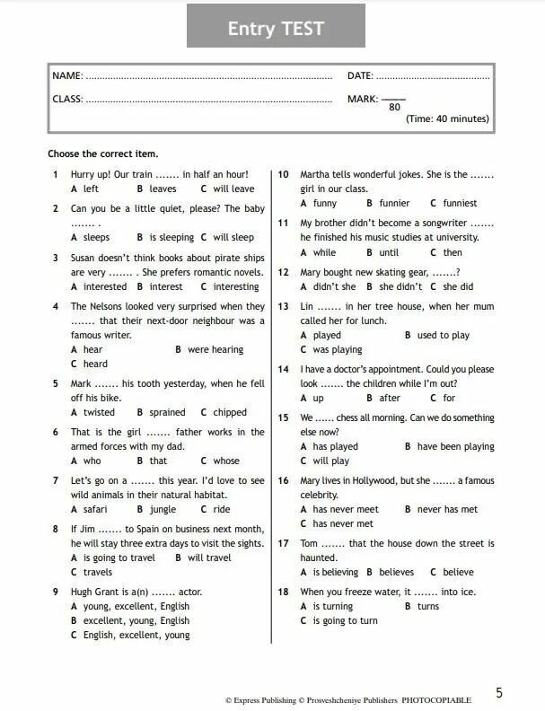 Тест предназначен для проверки знаний учащихся за 8 класс. Удобно поделен на разделы, всего их 8 и они соответствуют темам учебника Ваулиной. В каждом тесте от 24 до 47 заданий, направленных на закрепление грамматических навыков, навыков чтения и перевода, также часто встречаются задания на подставление, выявление и описание. В конце сборника дан контрольный тест по всем восьми разделам. Ещё один плюс, это наличие ответов ко всем прилагаемым тестам, что очень удобно и для школьника и для родителей. Пособие также может использовать на своих уроках учитель.