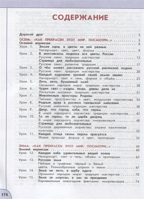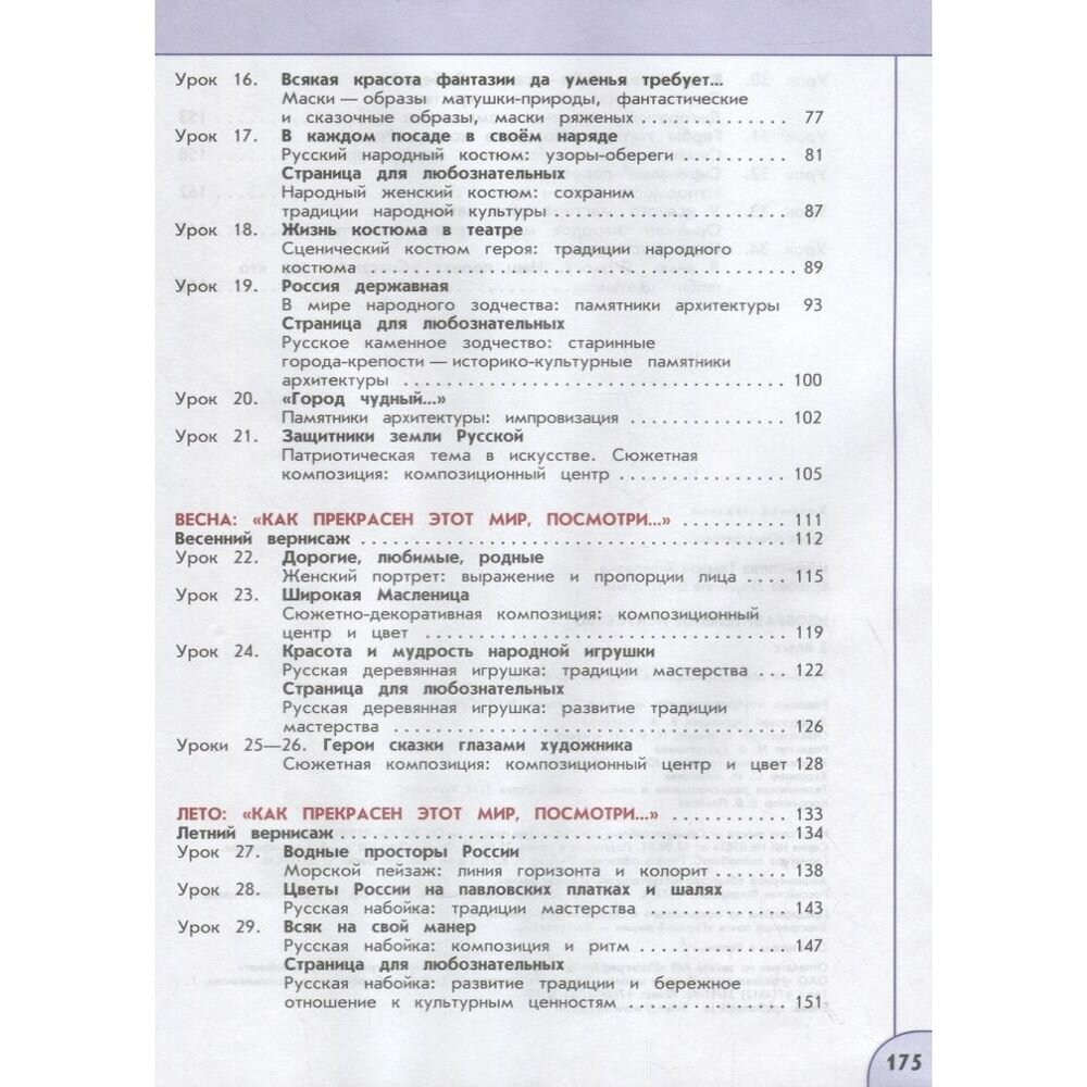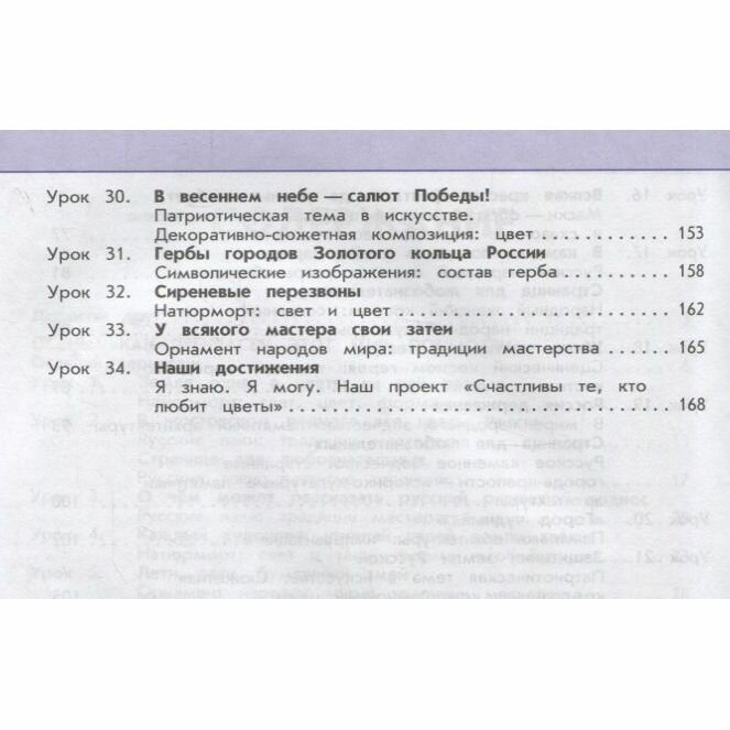 Учебник знакомит с творчеством выдающихся деятелей национальной культуры России, стран Западной Европы и Востока. Содержащиеся в нём художественно-творческие упражнения и задания направлены на развитие у учащихся способностей к художественно-образному, эмоционально-ценностному восприятию произведений изобразительного искусства, на освоение первоначальных знаний о пластических искусствах (изобразительных, декоративно-прикладных, архитектуре и дизайне) и их роли в жизни человека и общества, а также на выражение в творческих работах своего отношения к окружающему миру.