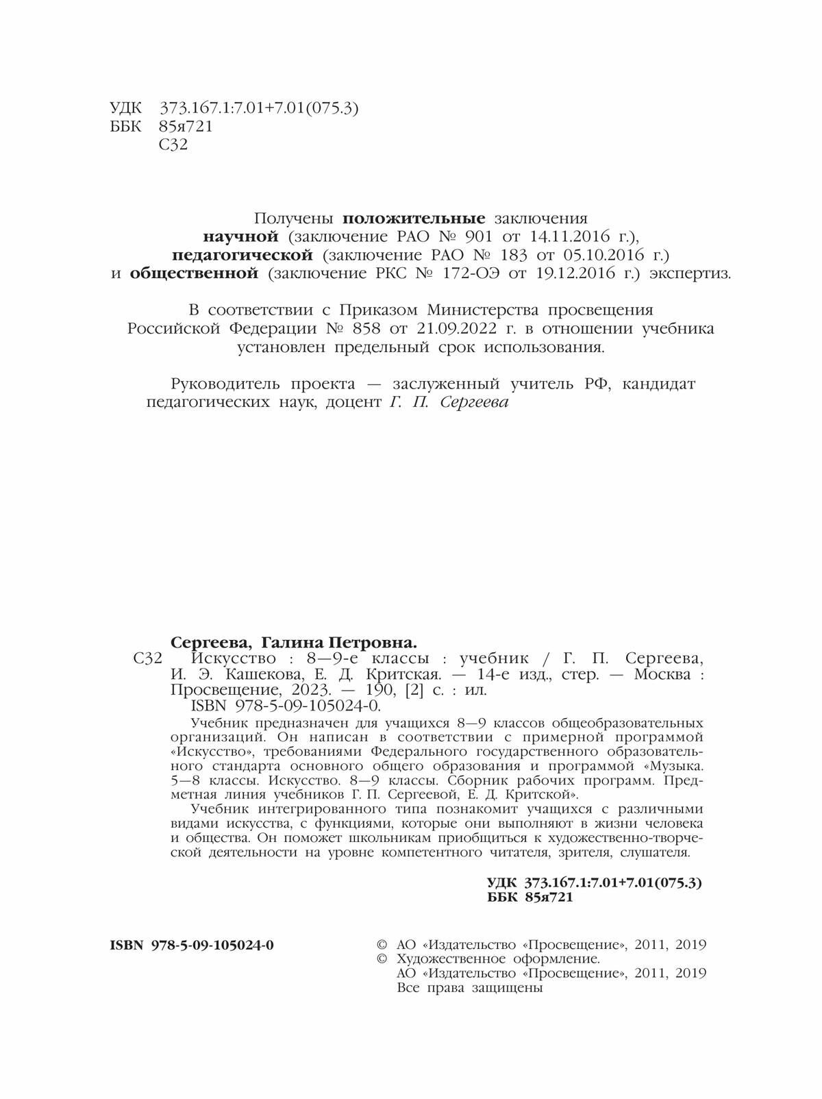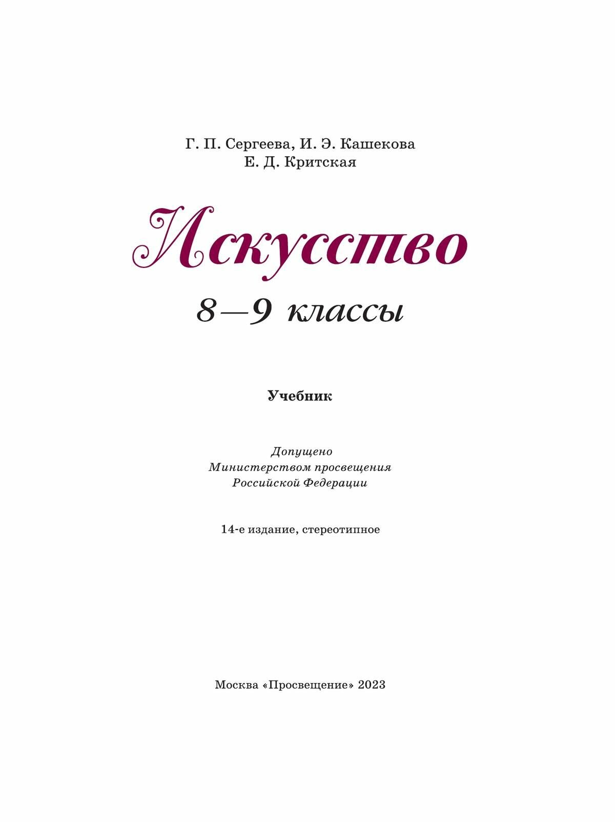 Искусство. 8-9 классы. Учебник. (Критская Елена Дмитриевна (соавтор), Сергеева Галина Петровна, Кашекова Ирина Эмильевна (соавтор)); Просвещение, 2019