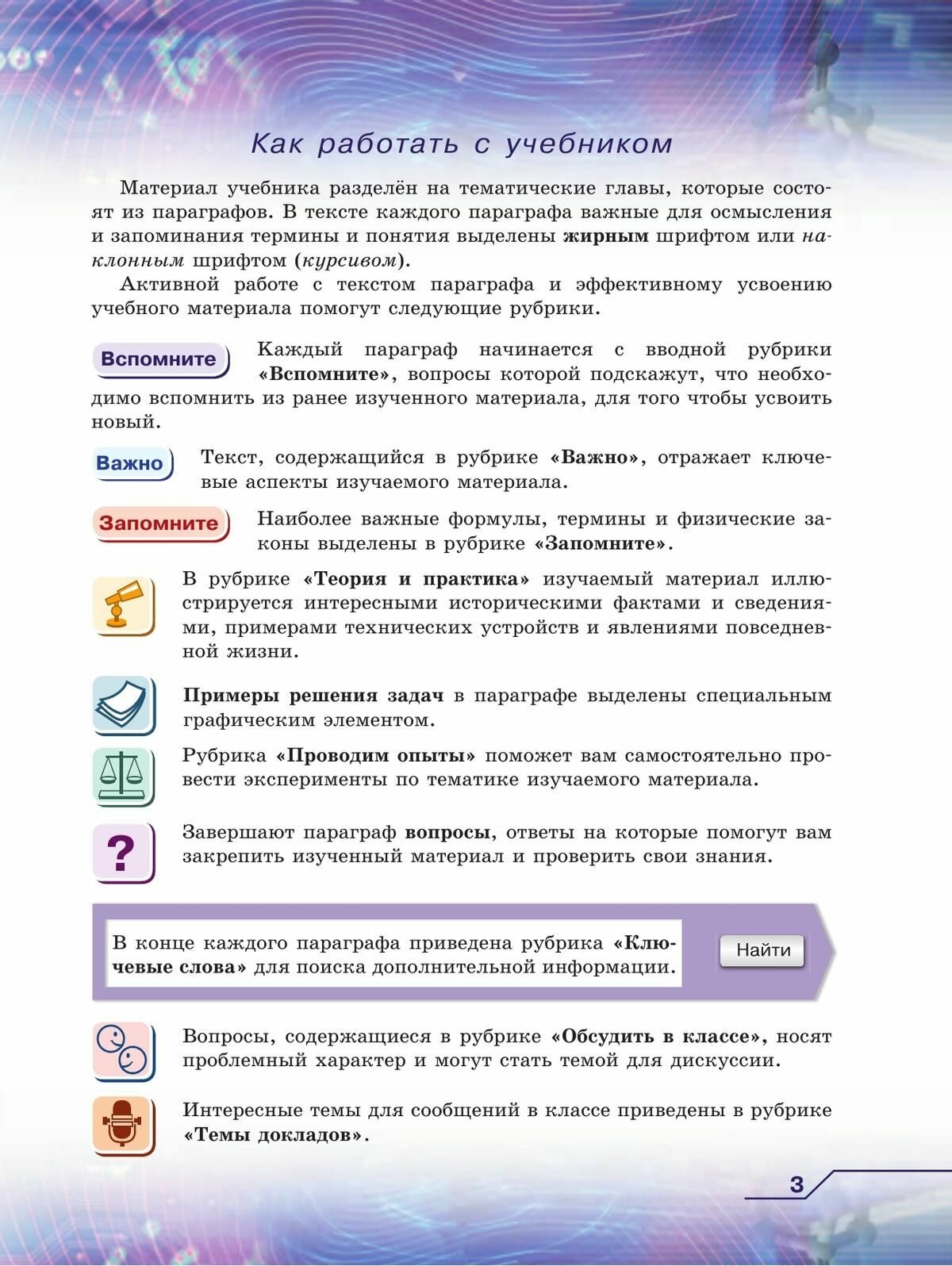 Материал учебника для 9 класса предполагает изучение курса физики на уровне ознакомления с физическими явлениями, формирования основных физических понятий, определения физических величин, приобретения умения измерять физические величины, применения полученных знаний на практике.