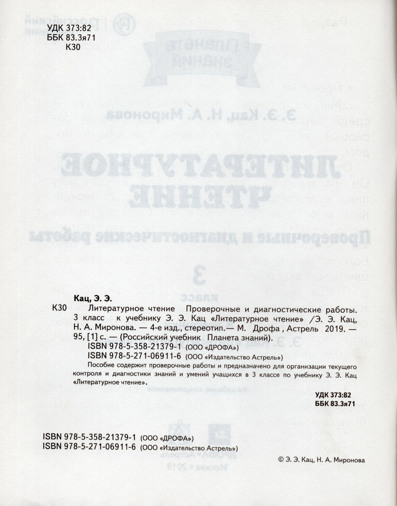 Литературное чтение. 3 класс. Проверочные и диагностические работы. (Миронова Наталия Александровна, Кац Элла Эльханоновна); Дрофа, 2019