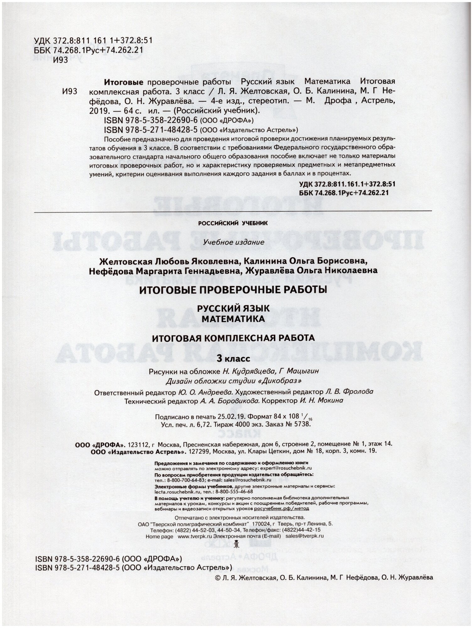 Русский язык. Математика. 3 класс. Итоговые проверочные работы. Итоговая комплексная работа (Калинина Ольга Борисовна (соавтор), Журавлёва Ольга Николаевна (соавтор), Желтовская Любовь Яковлевна, Нефедова Маргарита Геннадьевна (соавтор)); Дрофа, 2019