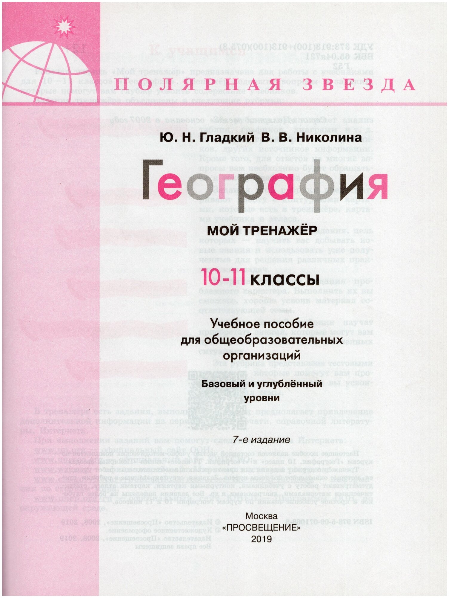 География. Мой тренажер. 10-11 классы. Базовый уровень. (Юрий Никифорович Гладкий, Вера Викторовна Николина); Просвещение, 2019