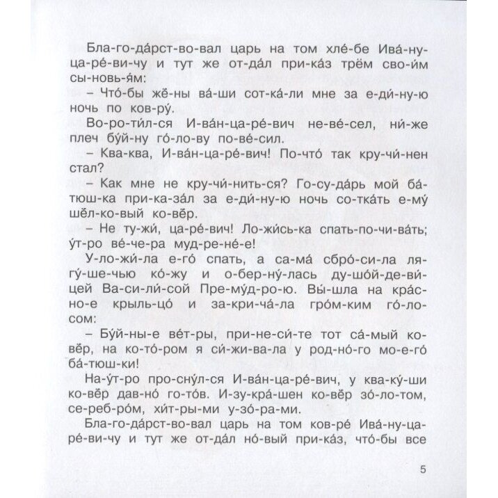 Книга очень понравилась, мы читали с удовольствием несколько раз. Очень любим книги из этой серии, "Царевна лягушка" нам особенно подошла, потому что короткая простая и понятная. Ребенок может легко ее прочитать сам, все слова разбиты на слоги, шрифт очень крупный, комфортно. Красивые, понятные, цветные иллюстрации, и их много. Я думаю, буду ещё покупать книги из этой серии, и всем их советую.