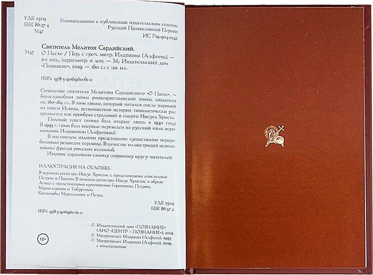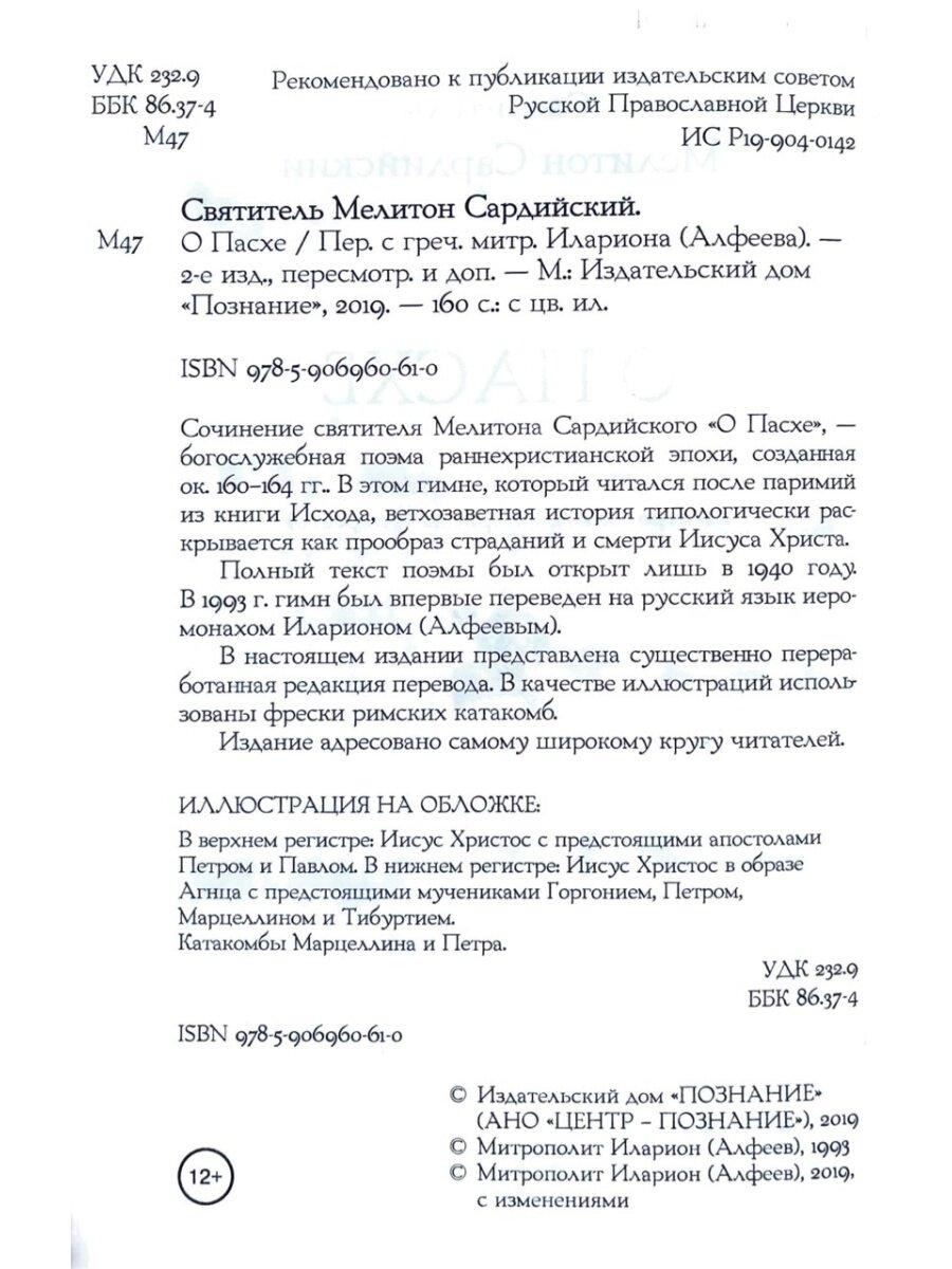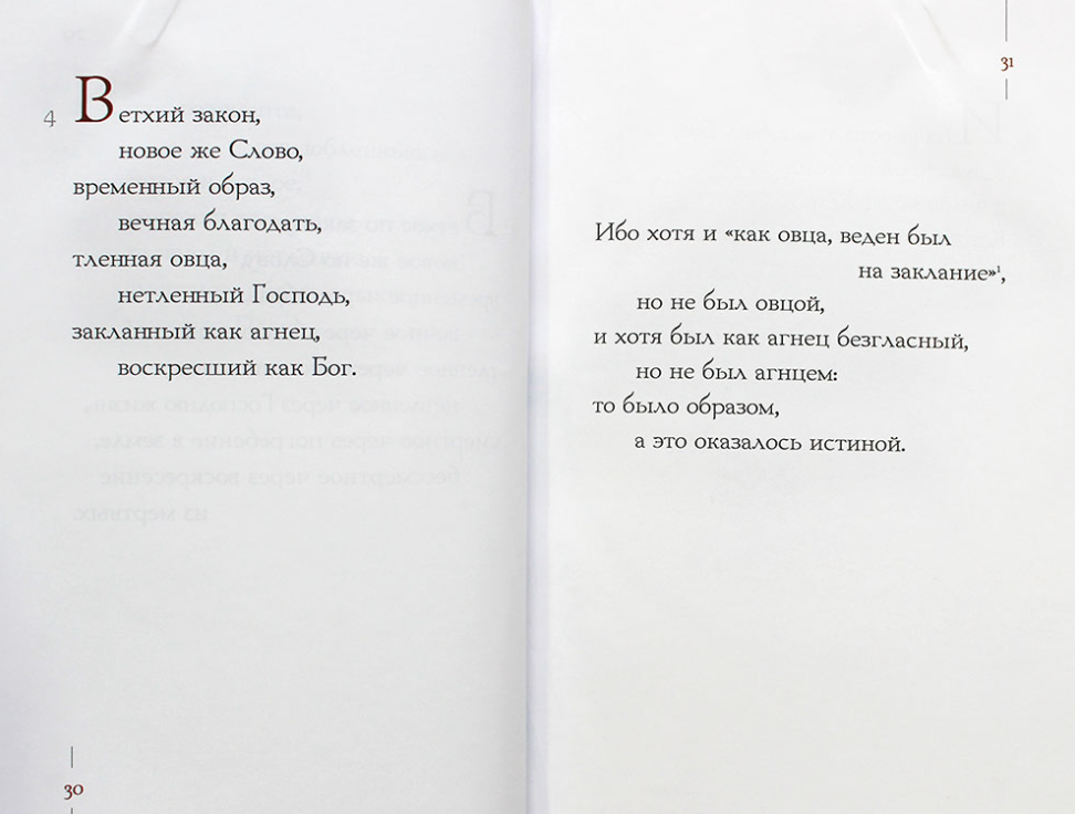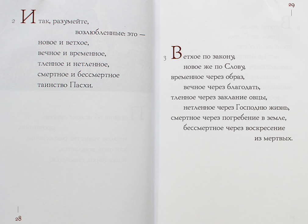 Красиво оформленная книга. Но самое главное - красивая по содержанию. В поэтичной форме Мелитон Сардийский (епископ Сарды и Лидии, живший во 2 веке), рассказывает о пасхе. Это не просто поэма, а поэма проповедь. Что особенно ценно для христиан!