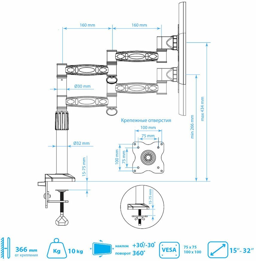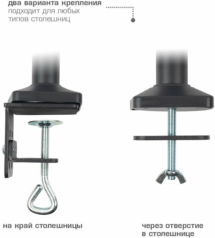| Функциональные особенности | поворотный, с регулировкой высоты, кабель-канал, струбцинное крепление |