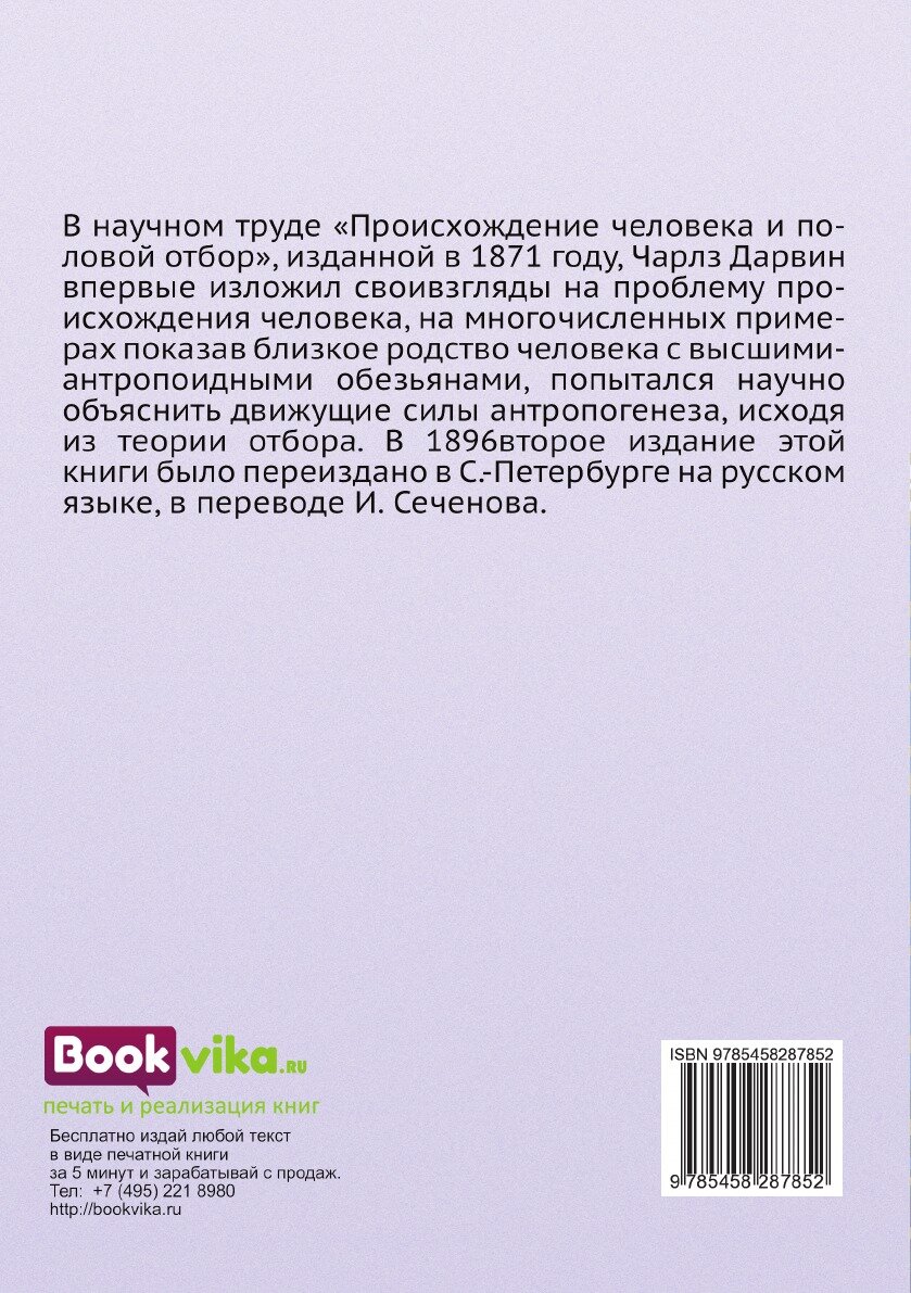 В научном труде «Происхождение человека и половой отбор», изданной в 1871 году, Чарлз Дарвин впервые изложил свои взгляды на проблему происхождения человека, на многочисленных примерах показав близкое родство человека с высшими антропоидными обезьянами, попытался научно объяснить движущие силы антропогенеза, исходя из теории отбора. В 1896 второе издание этой книги было переиздано в С.-Петербурге на русском языке, в переводе И. Сеченова. Воспроизведено в оригинальной авторской орфографии издания 1896 года (издательство "Издание О.Н. Поповой. С.-П.").