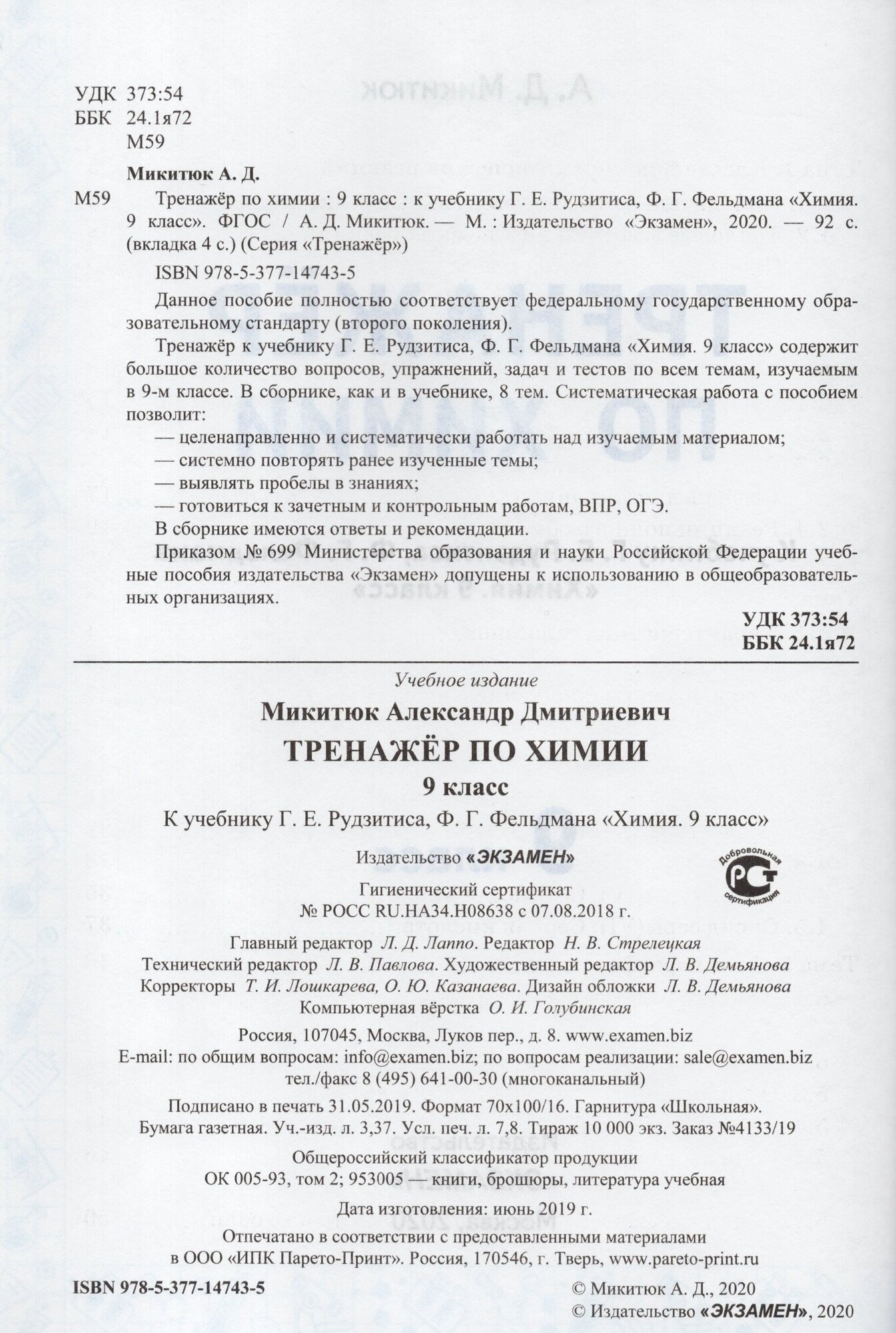 Тренажер по химии 9кл К учебнику Г. Е. Рудзитиса Ф. Г. Фельдмана Химия. 9 класс. . (Микитюк Александр Дмитриевич); Экзамен, 2020
