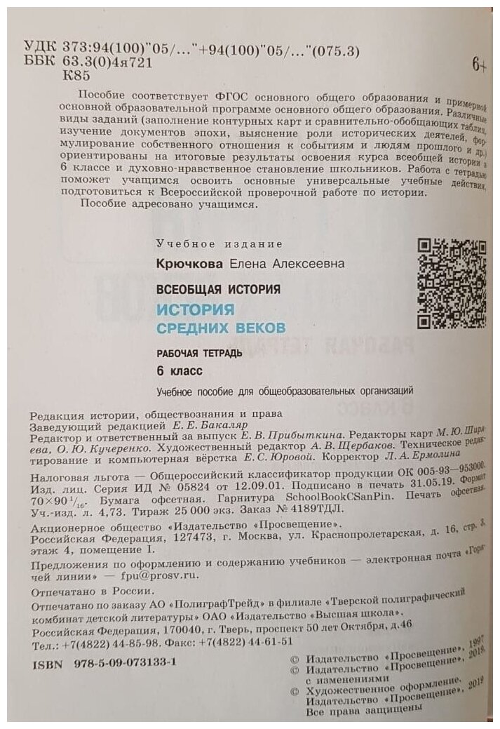 Пособие переработано в соответствии с Федеральным государственным образовательным стандартом основного общего образования. Различные виды заданий (заполнение контурных карт и сравнительно-обобщающих таблиц, изучение документов эпохи, выяснение роли исторических деятелей, формулирование собственного отношения к событиям и людям прошлого и др.) ориентированы на итоговые результаты освоения курса всеобщей истории в 6 классе и духовно-нравственное становление школьников. Работа с тетрадью поможет учащимся освоить основные универсальные учебные действия.
