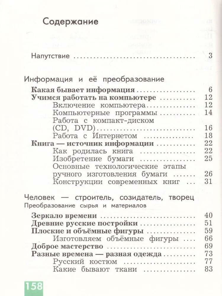 Учебник входит в систему "Начальная школа XXI века". Знакомит учащихся с рукотворным миром как явлением культуры в её историческом развитии, с основными технологиями человеческой деятельности, связанными с преобразованием сырья и материалов, энергии и информации. Соответствует федеральному государственному образовательному стандарту начального общего образования.