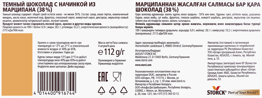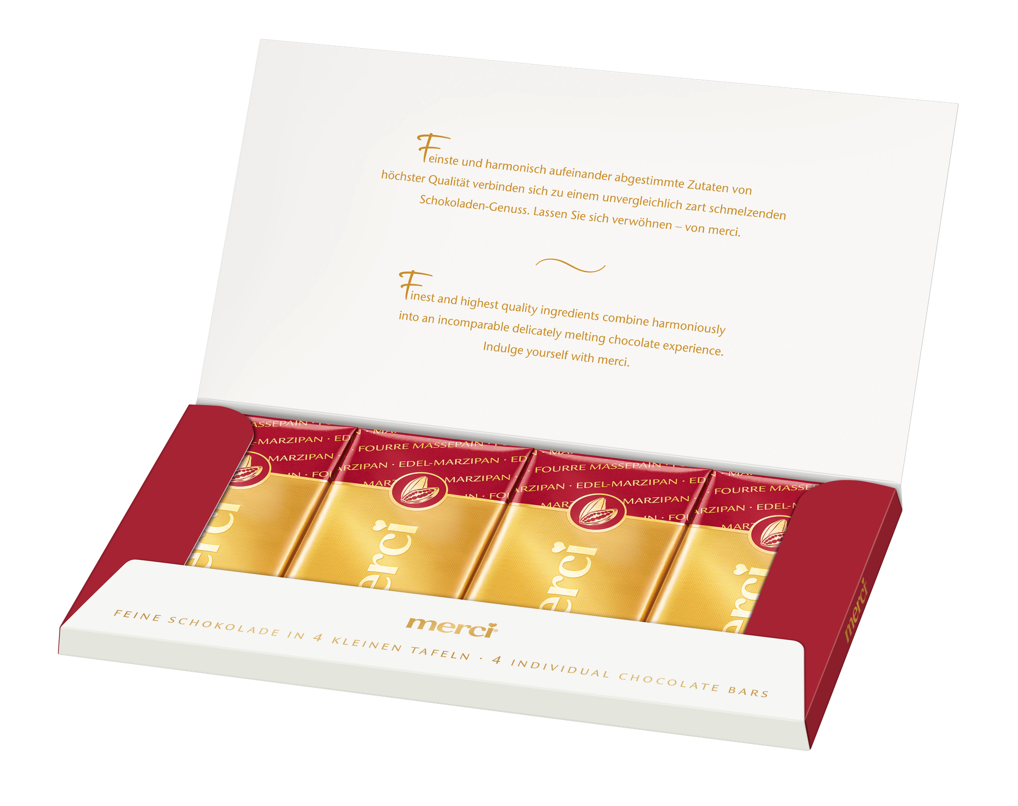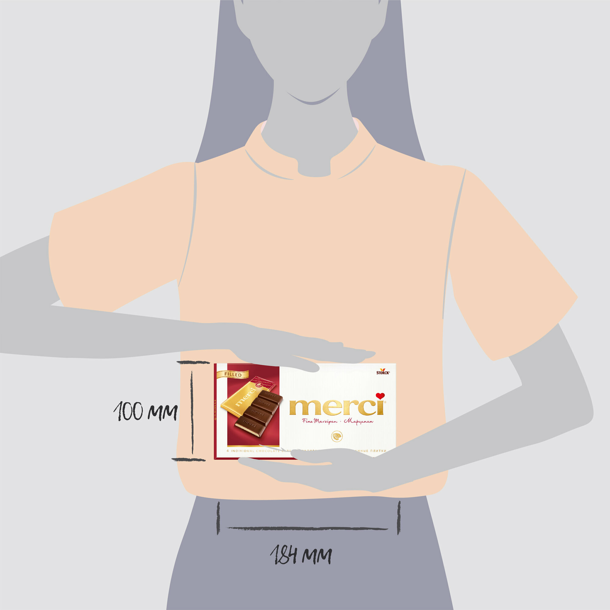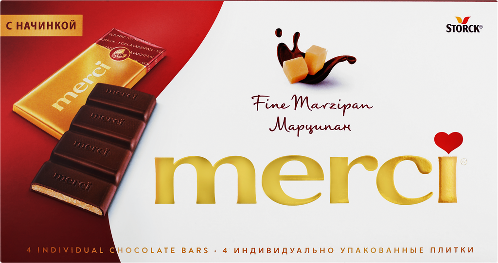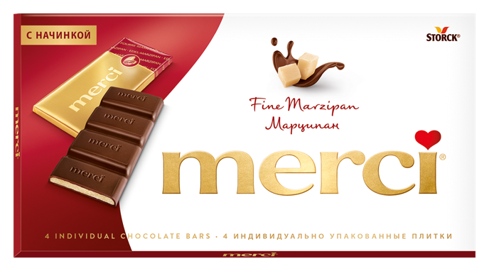 Описание товара:Шоколадные плитки Merci – это: шоколад высочайшего немецкого качества; 4 изящных, индивидуально упакованных плиточки шоколада; оригинальная упаковка в виде конверта; изысканный вкус.Состав товара:Сахар, какао тертое, тертый миндаль (13,9%), какао-масло, молочный жир, фруктоза, сироп глюкозы, инвертный сахарный сироп, декстроза, эмульгатор: соевый лецитин, натуральный ароматизатор, экстракт ванили.